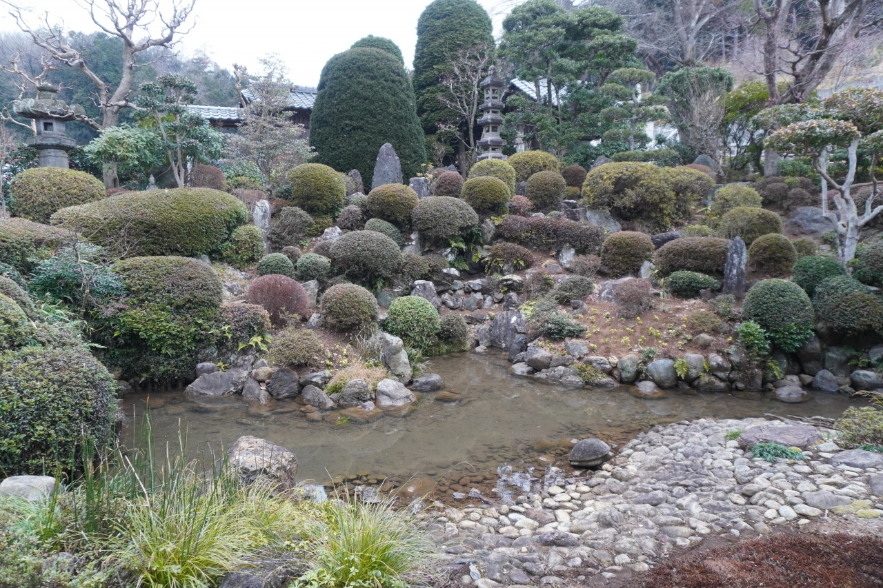 で、見どころは本堂裏手の日本庭園。明治期に、地元の庭師、水村藤四郎が作庭した本格的禅宗式庭園。池の奥の築山には立石を多用して荒々しさと静けさを両方表現しているように思います。