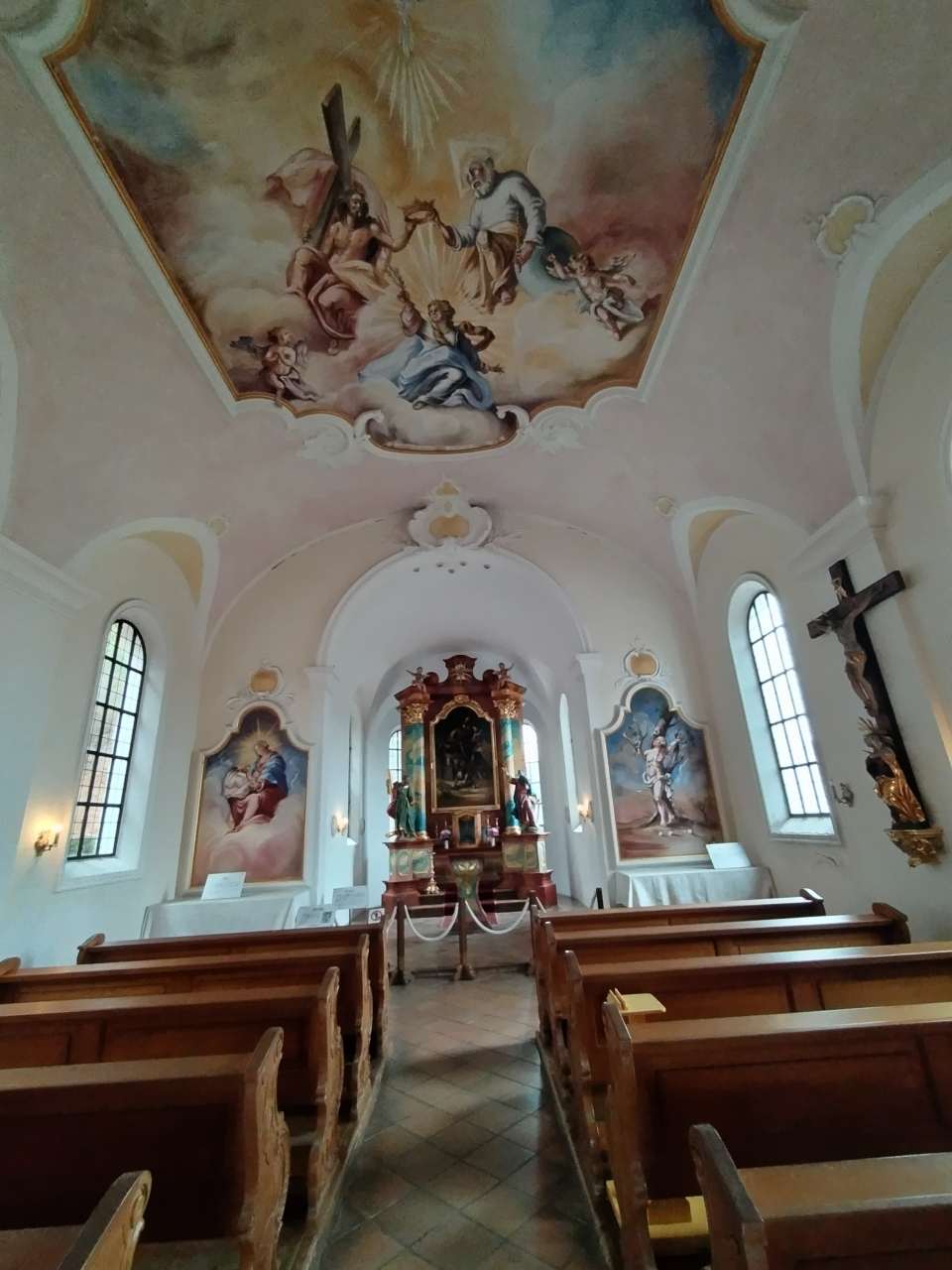 一番奥には聖ゲオルグ礼拝堂があり、小さいながらも天井画が素敵な教会を見ることができます。メインの建物はお土産が中心で、ドイツらしいかわいらしい建物です。