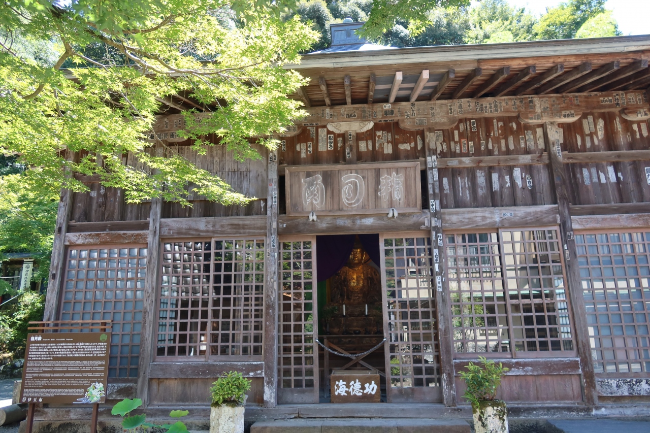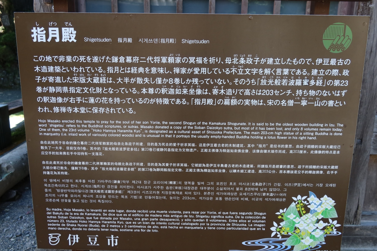 修善寺 源氏公園の奥の方にある木造のお堂が指月殿です。北条氏によって修禅寺に幽閉され、そして暗殺された鎌倉二代将軍 源頼家を弔う為に、頼家の母、北条政子によって建立されたお堂です。伊豆最古の木造建築と言われ、中には金箔が貼られた釈迦如来坐像が安置されています。