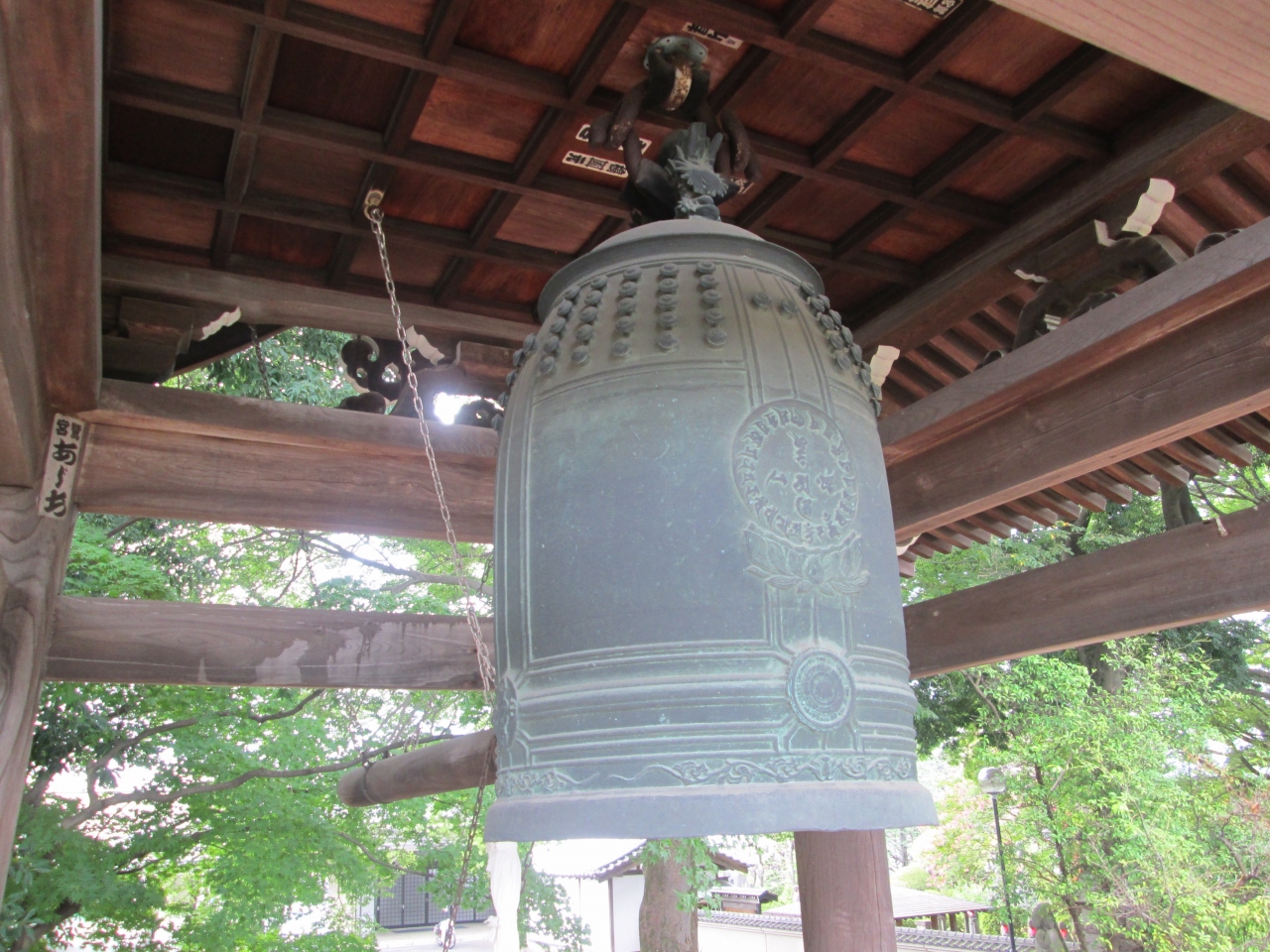 愛染院観音寺は真言宗豊山派の一寺で、創建は1437年、開山は能円坊尊岳和尚、本尊は愛染明王像です。山門を潜ると左手に鐘楼があり、その中に梵鐘がかかっています。1701年銘の区指定文化財で、区内でも古い部類の梵鐘です。京都知恩院や奈良東大寺にある梵鐘に比べて小さく、青銅製であるので錆びず(緑青は発生する)銘以外に歴史を感じさせるものは無く、建造物や仏像に比べ感慨が湧きません