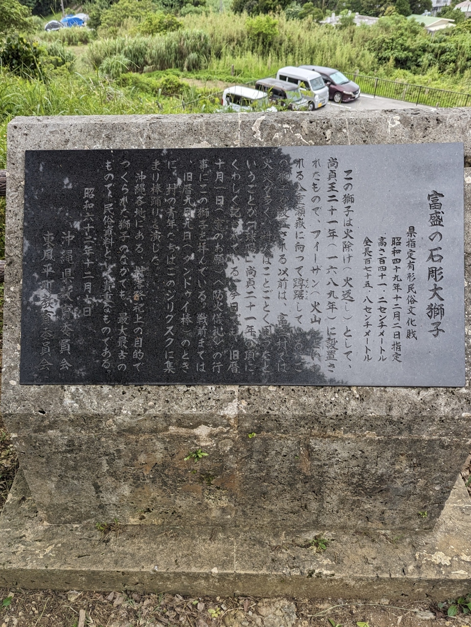 沖縄で最も古い石獅子として知られているこの石獅子は第二尚氏王朝の時代である尚貞21(1689)年に作られたとされている。作者は不明ではあるが、その当時この辺りの富盛地区に火災が多かったことから風水で八重瀬岳に向けてシーサーを作れば良いと助言され、火除けの目的で作られたとされている。以降火事は減り、富盛の街を守るように眺めつつ現在に至っている。古の火消し、そして戦跡として350年もの間子機の変遷を経験してきた。今後良い方向に舵を取る様子を今までと変わらず見守ってほしいと思えた私であった。