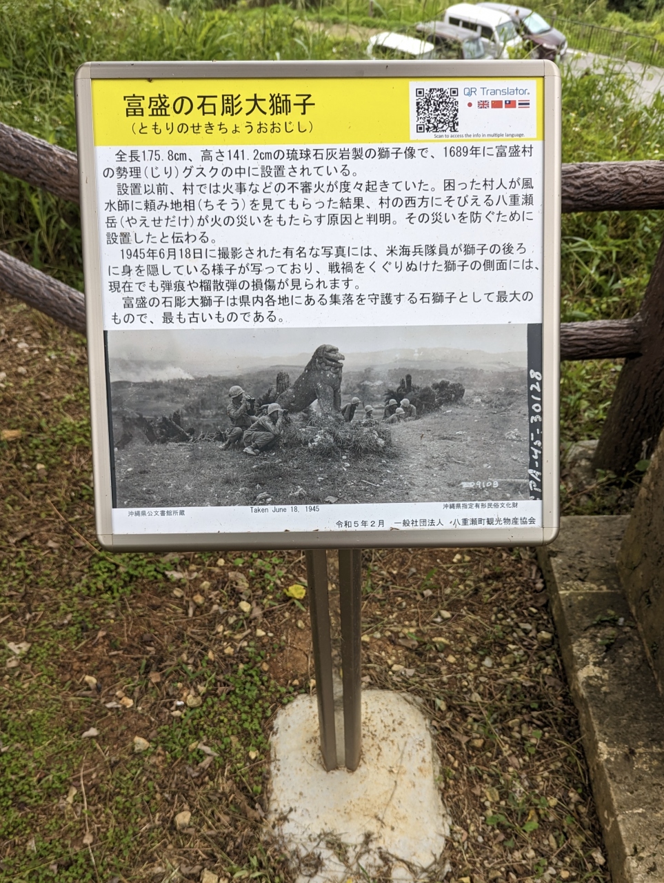第二尚氏王朝の時代に〝火消し〟の役目を受け、この地に建てられた富盛の石獅子は、記録に残っているものの中では最も古いものとして知られている。沖縄戦時には熾烈な戦いが行われた当地に於いて、その模様を今日に伝えるものとして、石獅子を盾にして弾丸を避けている米兵の姿を収めた写真でも有名だ。