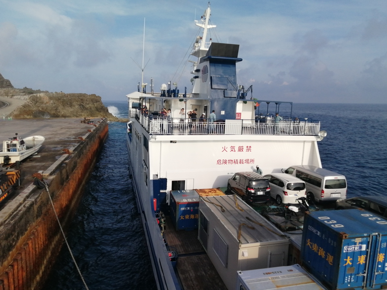 大東海運が運航する、那覇と南北大東島を結ぶ貨客船です。クレーンに吊られたかごに乗って島に上陸するという体験をしてきました。しかし、なかなかハードルが高い…。週に1便ほどしか出航しておらず、所要約15時間。それに波による欠航が多く、当日の朝に出航延期なんてことも多々あります。ガチガチの日程しない方はリスク高いので要注意です。