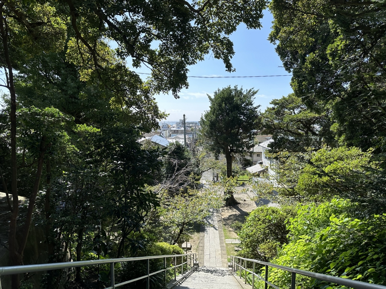 上ってきた階段を振り返ると、高台からのすばらしい景観が広がっています。由比ガ浜の街の向こうに相模湾の海がキラキラと輝いていて、絶好の写真スポットです。