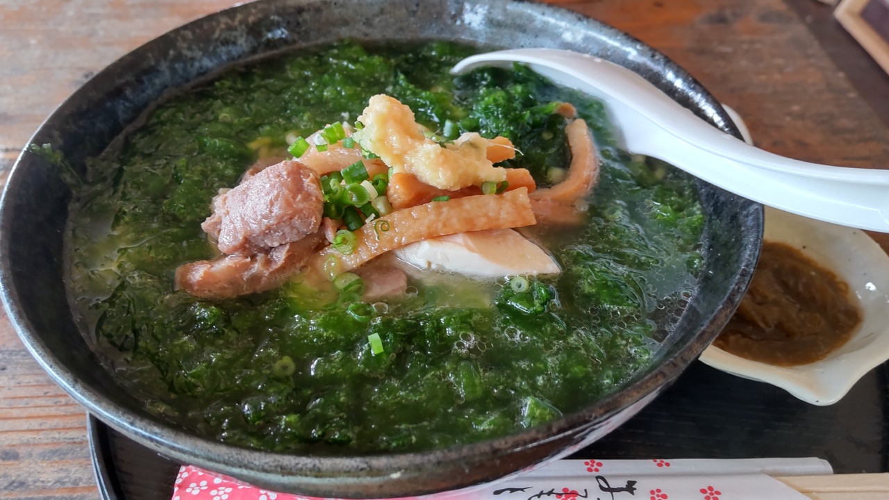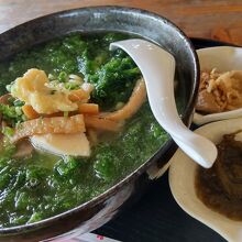 八重山そばに細切り豚肉とゆし豆腐といっぱいのアーサ。