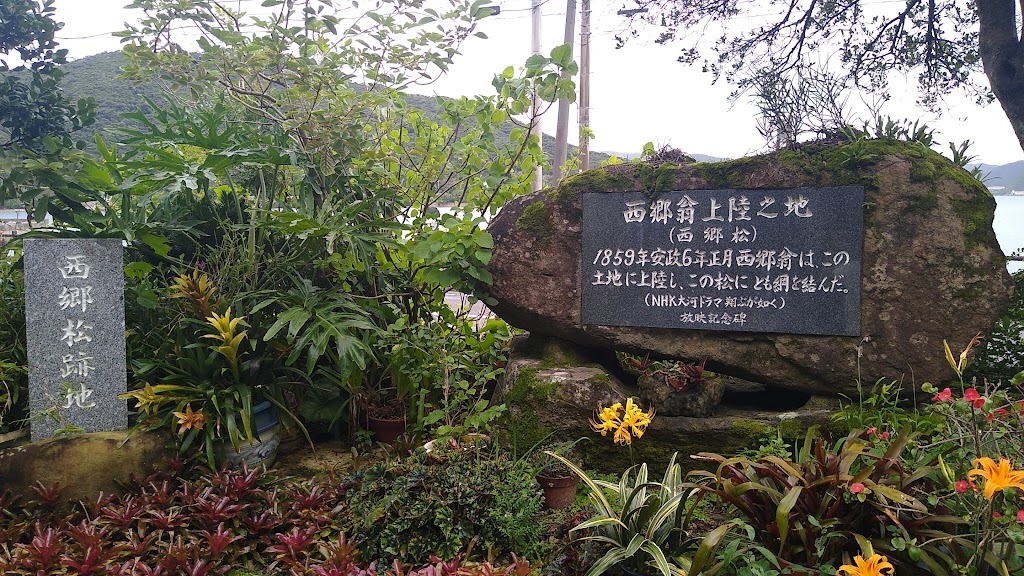 この地にかつてあった松は、薩摩からの定期便を係留していたが、西郷が流されてからは「西郷松」と呼ばれるようになった。2011年に枯れて伐採され、西郷・愛加那像になって「りゅうぐう館」に展示されている。