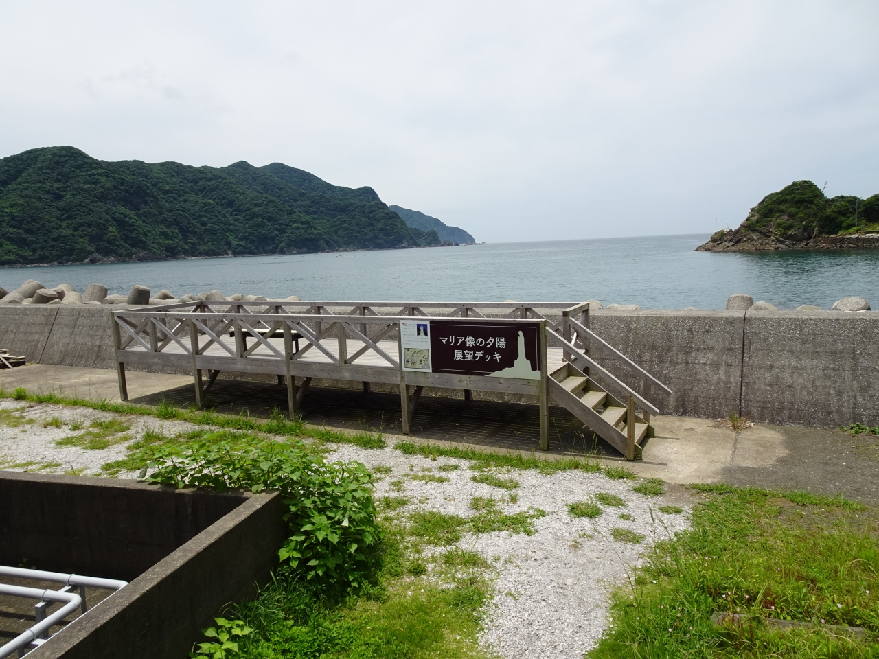 崎津集落を散策するために、下町南駐車場に車を停めました。そこからすぐの所に、海上マリア像展望デッキがあります。展望デッキから、海上マリア像を見学することができました。海に向かって建っているマリア像。岩場に建っています。真っ白な横向きのマリア像が見えました。キリスト教信仰のシンボルとして、1974年に建てられたそうです。魚船の運航の安全と豊漁を見守っていますよ。
