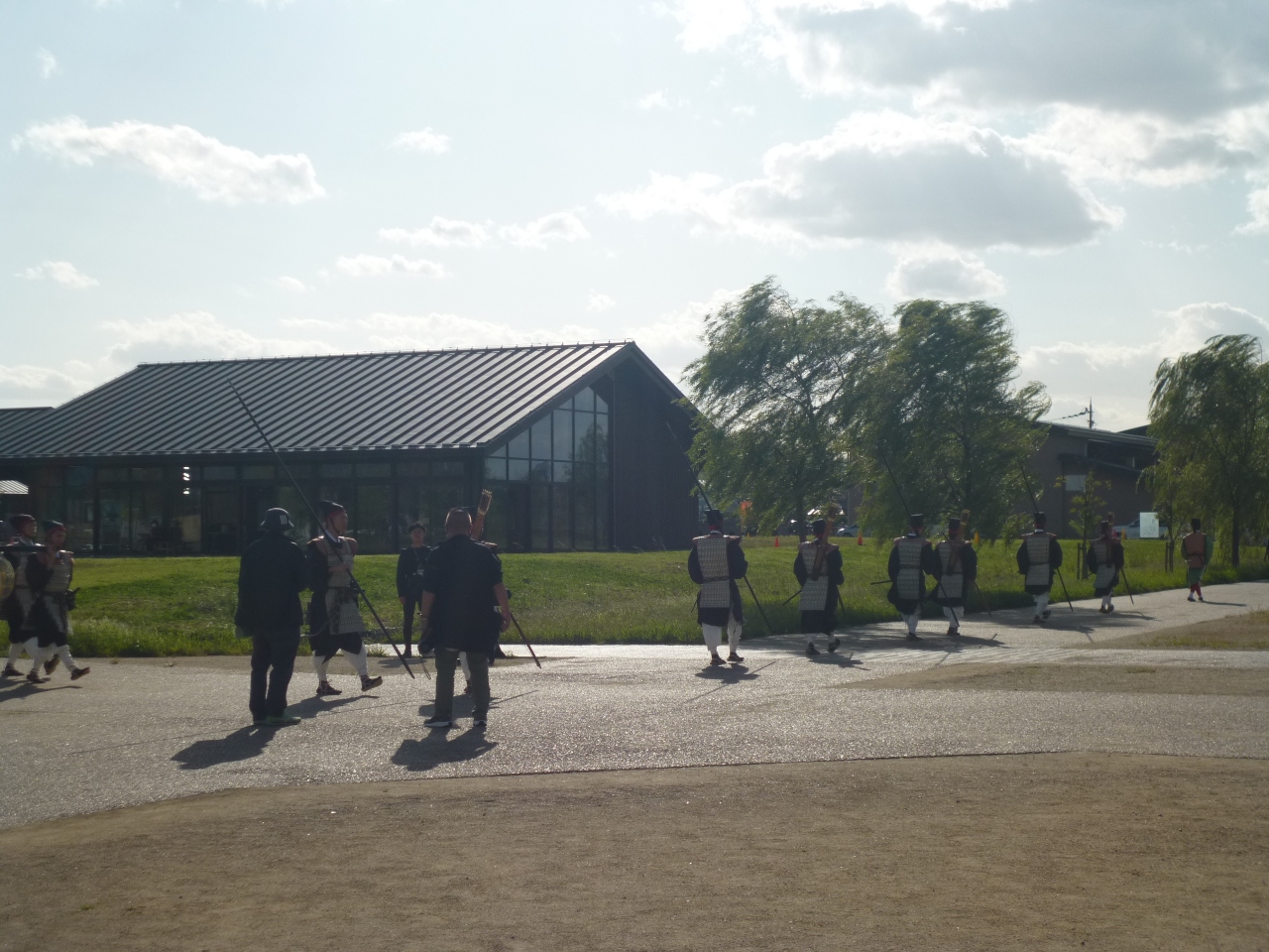 平城京跡の復元された朱雀門の前に朱雀門広場があります。ここには平城遷都1300年祭で開館した平城京歴史館がありましたが、現在は、リニューアルして観光交流施設になっています。西側の建物群近くには展望テラス、東側のいざない館には平城宮全域の復原模型や出土品を見ることができます。建物前では、平安装束のをして楽器を持っている人たちがお祭りの練習のようで行進をしてるのも見ることができました。