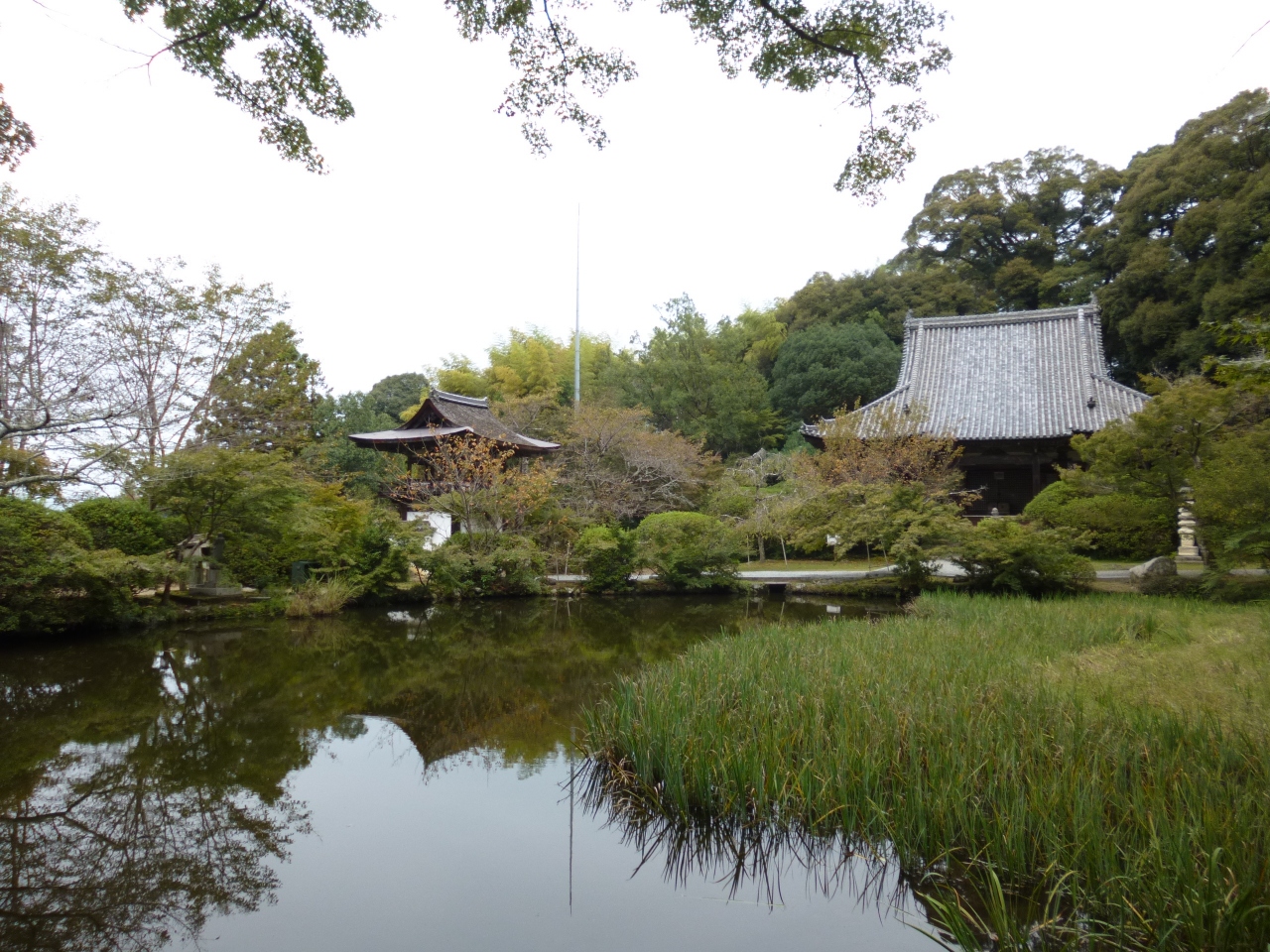 山の辺の道にある長岳寺へ向かいました。弘法大師が大和神社の神宮寺として創建した古刹です。我が国最古といわれる美しい鐘楼門をくぐると広いお庭の中に本堂があります。受付で和尚様に酔芙蓉が咲いていることを教えていただきました。池越しの本堂の風景が趣がありました。