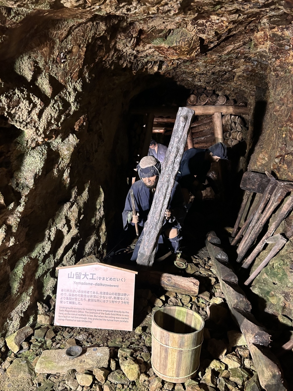 佐渡金山には宗太夫坑コースと道遊坑コースがあります。宗太夫坑は江戸時代初期に開削された手掘り坑道です。リアルに再現してあり実際に仕事をしているような人形がいたのでちょっと怖い感もありました。内部は気温が低く羽織るものを持って行って良かったです。スマホで解説が聞けるようになっていました。
