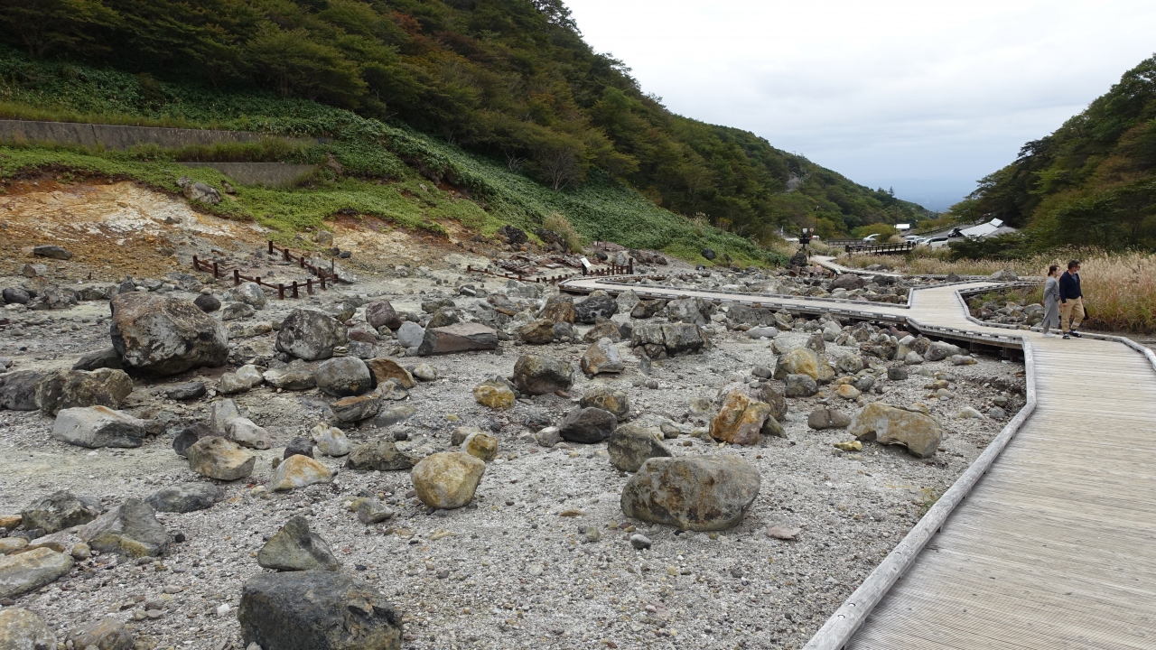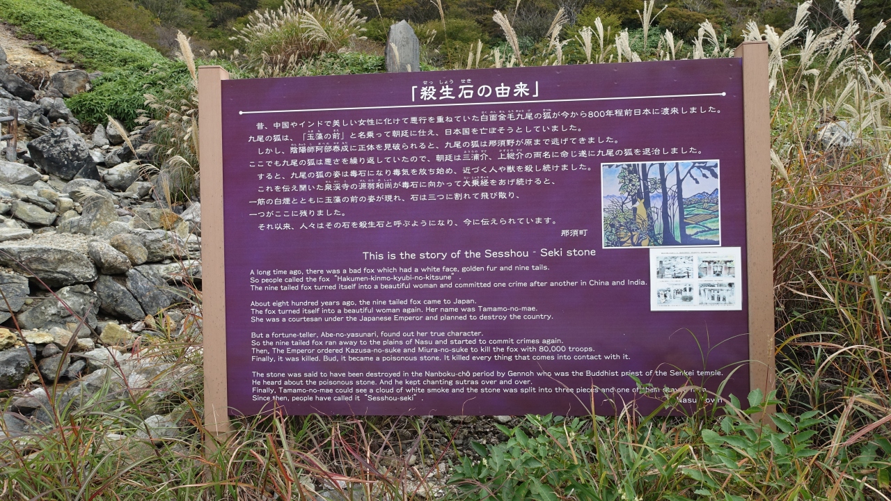 那須湯本温泉街の北外れに岩だらけの荒涼とした場所がある。辺りには硫黄の臭いが漂い、ここから流れ出す湯川の川底は硫黄成分で真っ白。ここには散策用の木道があり、奥の突き当りにあるのが「殺生石」と呼ばれる山肌が露出した場所にある大岩。大昔中国やインドで悪行をつくした「九尾の狐」が化身したともので、岩になっても毒気を放ち人や獣を殺し続けたため,高僧が法力で鎮めたという伝説が残る。