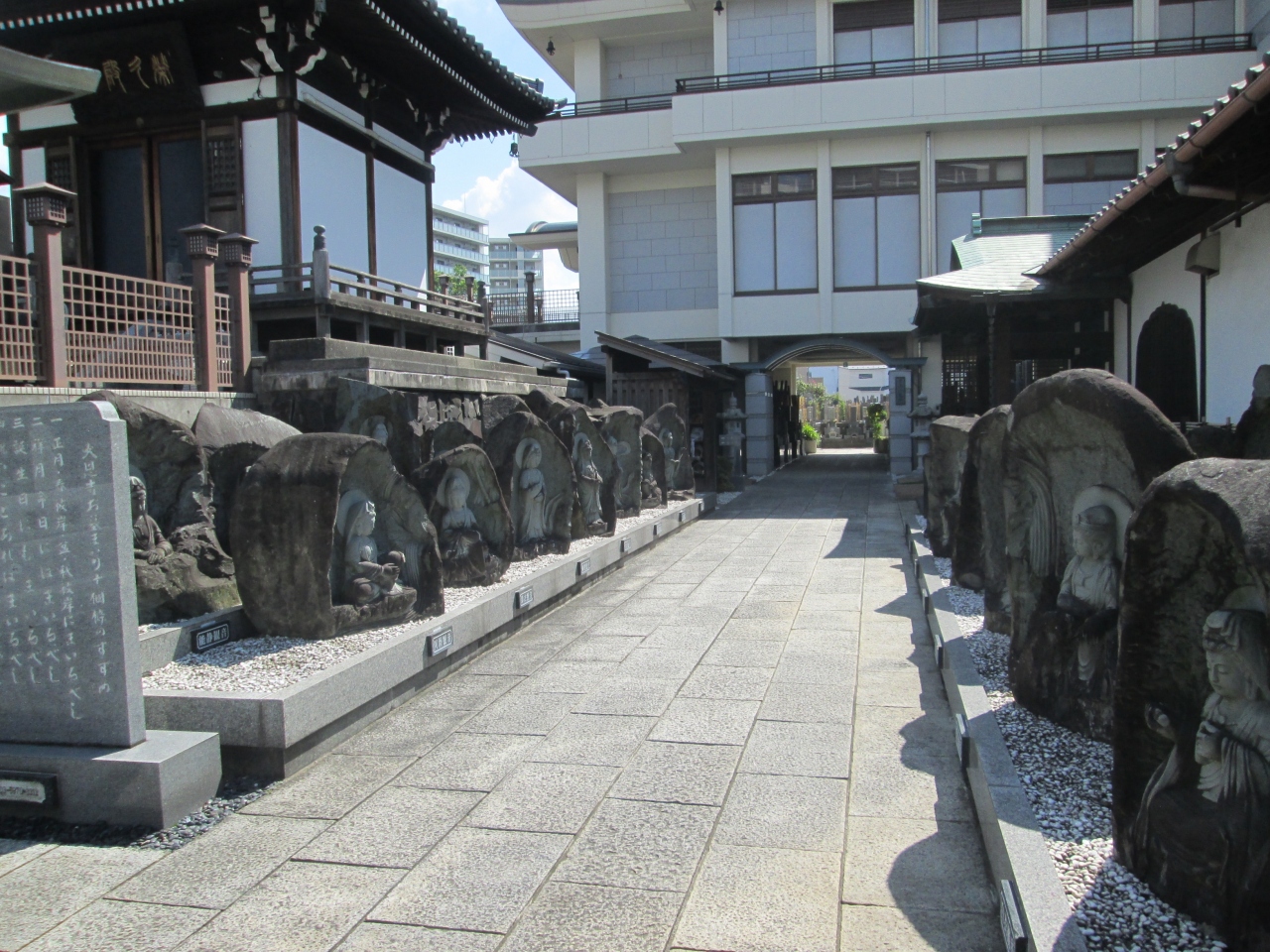 日蓮宗の一寺、創建は1624年、開山は寂静院日賢和尚、本尊は釈迦牟尼仏像です。山門前に仁王像が立つ、山門を潜ると、自動車供養が出来る人動車観音、33観音、栄久堂、コンクリート造りの二階に本堂があります。和風の山門に、コンクリート造りの本堂とはアンバランスな感じがします。境内には三十三体の観音様が並んでいますが、壮観です。三十三観音と聞くと、私は西国や坂東等三十三観音(霊場)巡りを頭に描きますが、観音様が三十三種類あるのを初めて知りました。殆んど名前は知りませんでした。一つ勉強になりました