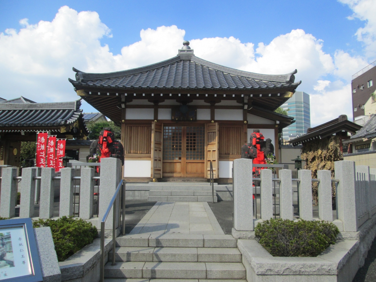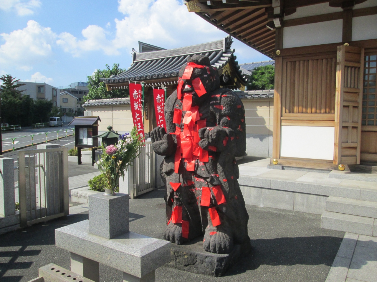 真言宗豊山派の一寺、創建は1491年、開山は源雅和尚、本尊は不動明王像です。山門手前に、明尊堂と赤紙仁王像、六地蔵、育児地蔵、不動明王、山門を潜ると、本堂、水子地蔵、弘法大師像、宝篋印塔、平和観音、雀供養塔等があります。この仁王像に赤紙を自分の患部と同じ処に貼って病気平癒を祈願するのですが、以前他の人のブログの写真を見て、仁王像が見えないほど赤紙が貼られていて、像が見られないと心配していました。本日訪れて、像を拝むことができ良かったです。太田南畝の狂歌が刻まれている、雀供養塔は筍の形をしており、珍しく拝見しました