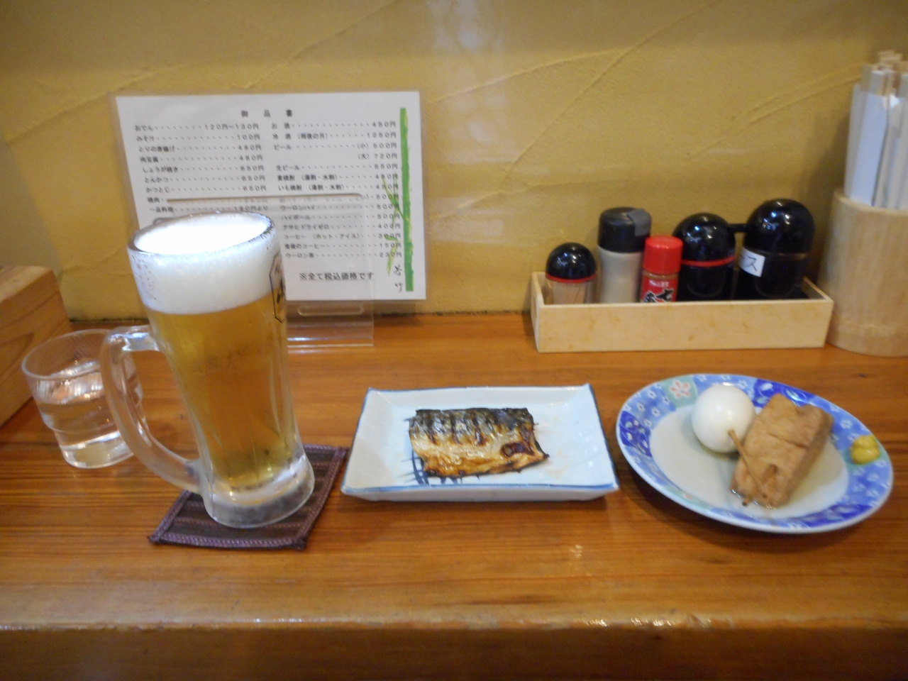 800円のほろ酔いセット。これは中生ビールと、おでん2本、おかず1品をセレクト