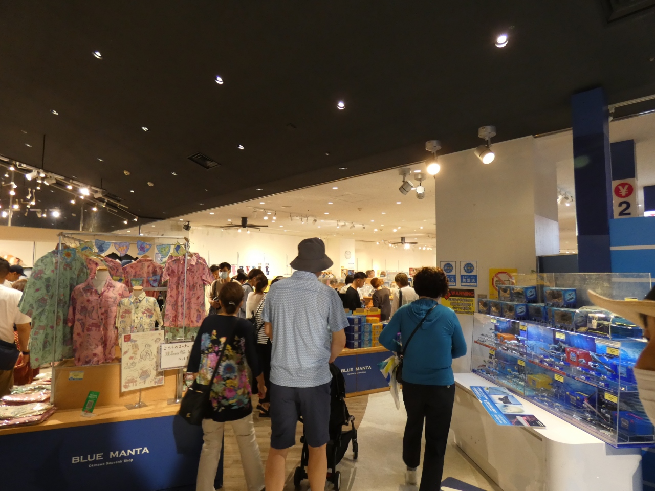 水族館に隣接する「美ら海プラザ」内にある人気のショップ。沖縄特産の御菓子やTシャツ、ジンベイザメやマンタのぬいぐるみ、携帯トラップなどオリジナル商品が沢山並んでいます。子供用のTシャツが値打ちで販売されているので購入します。観光客で大混雑している人気のスポットです。。