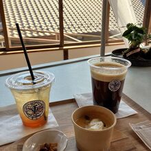 吹き抜けのイートインスペースと裏庭にバルコニー席と2階にテラス席が用意されています。
