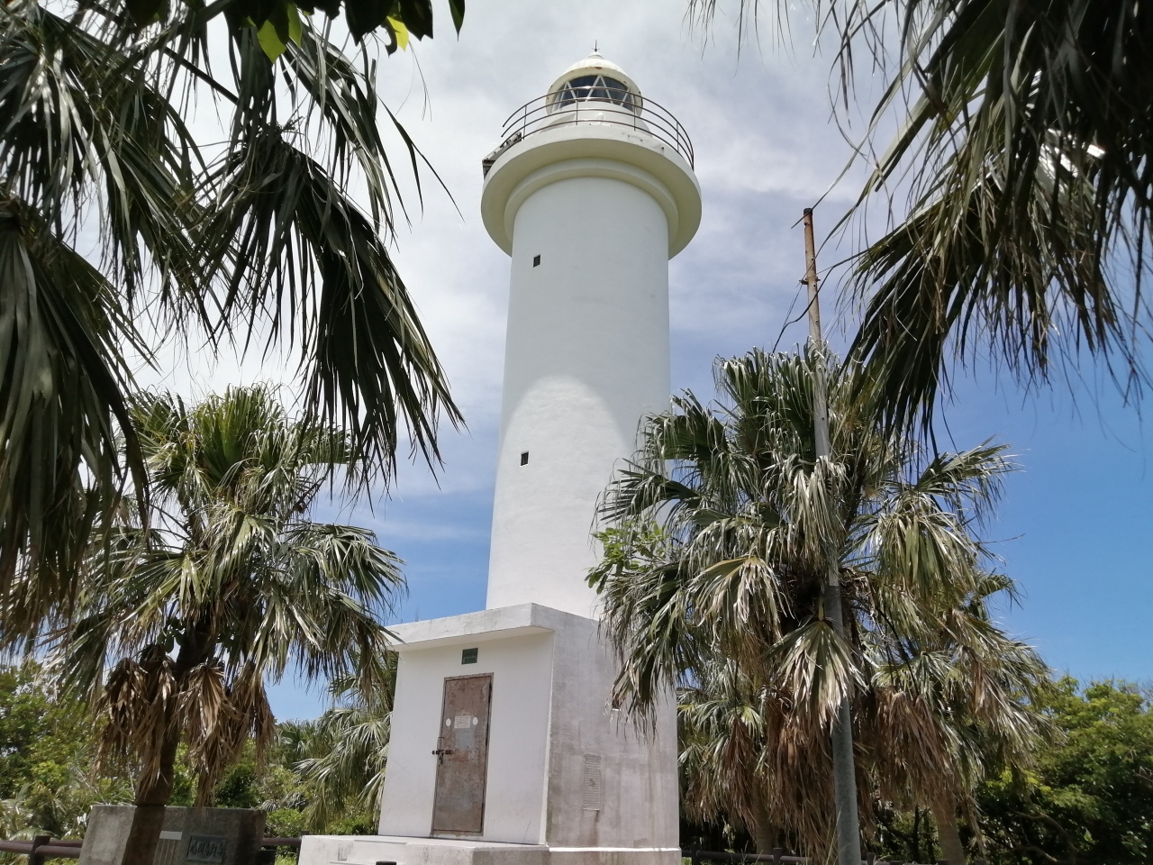 島の中央部にある鳩間中森の森の中に立つ灯台です。灯台には登ることはできません。標高34mの島一番の高台にあるのにもかかわらず、木々がじゃまをして眺めはそれほどよくありません。鳩間港の堤防とその先の西表島が見えるだけです。