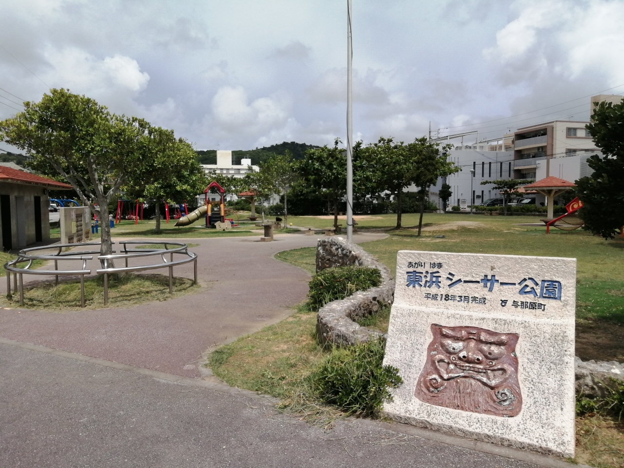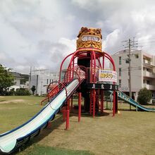 与那原町、埋立地の新興住宅地の一画にあるローカル公園です。その名のとおり公園の目玉となる滑り台にはシーサーがあしらわれて沖縄の雰囲気満載です。芝生の敷き詰められた、小さいながらも気持ちのよい公園です。