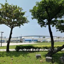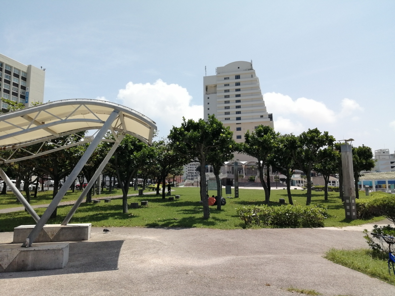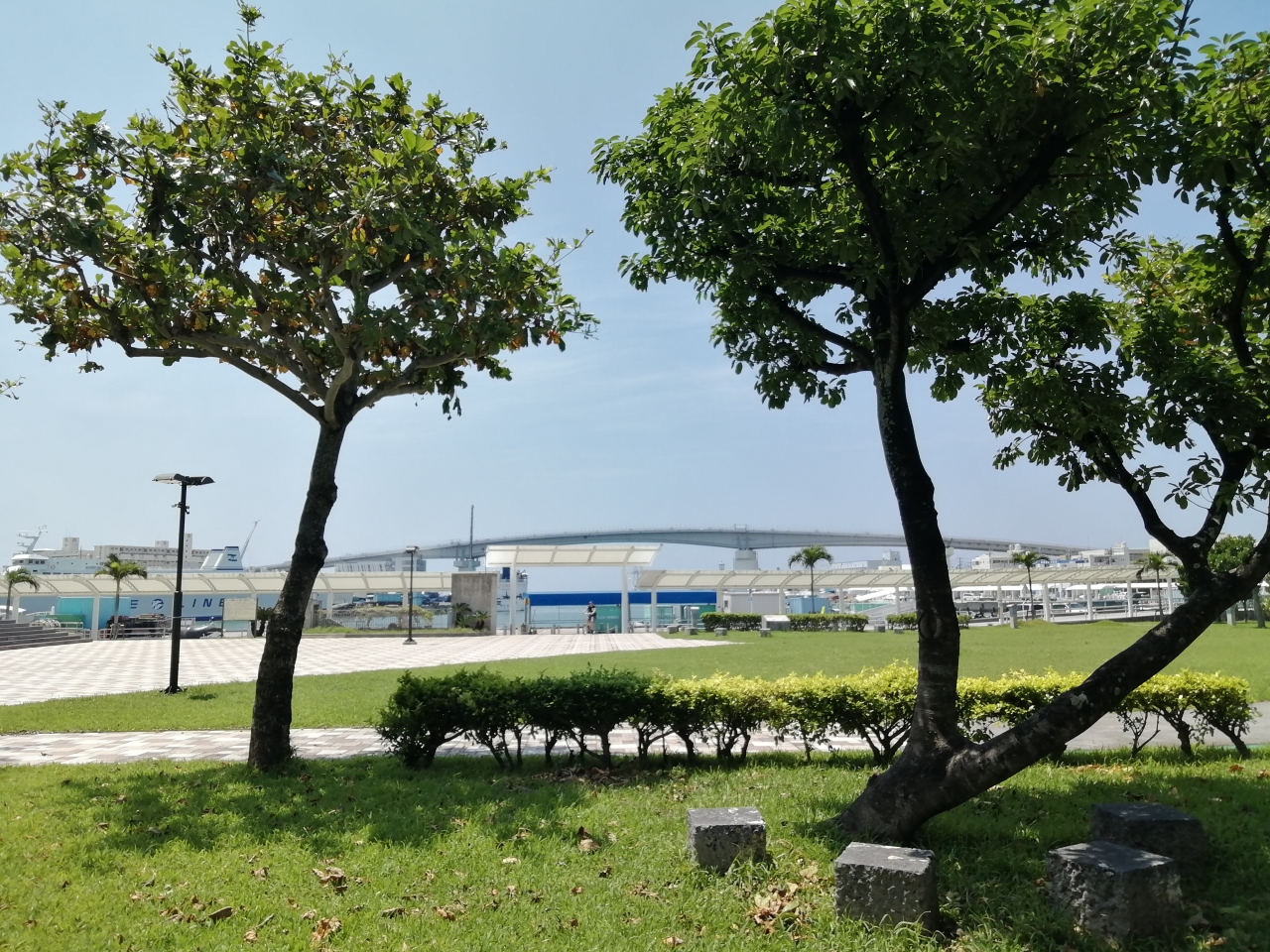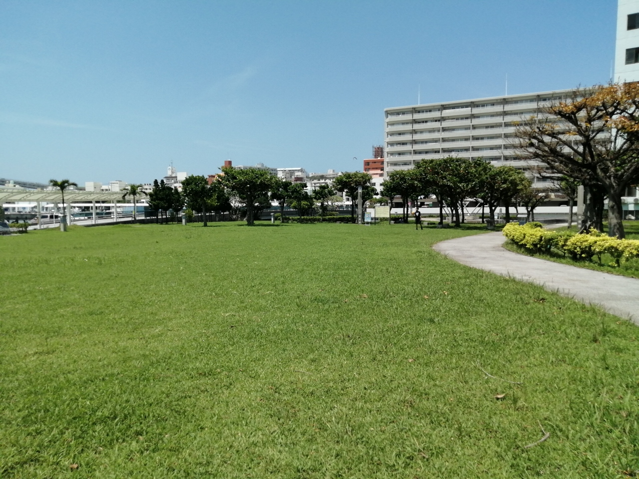 「泊ふ頭旅客ターミナル(とまりん)」の北側にある公園です。一面に芝生が植えられ海沿いということもあり、とても開放感溢れる気持ちのよい場所です。園内には遊歩道やベンチ、木陰もあるので体を動かしたり、のんびりくつろいだりすることもできます。また泊港をまたぐ優雅な「泊大橋」の眺望スポットでもあります。