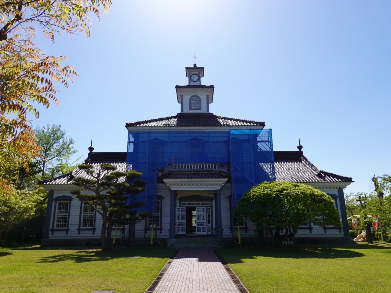 歴史的建造物が並ぶ「致道博物館」の中で、最も関心を抱いていた「旧西田川郡役所」ですが、あいにく足を運んだ時は工事中で内部の見学は出来ず、また正面から見た姿は、足場が組まれ一部がシートで覆われていました。特徴である時計台こそ見えたものの残念な光景でした。