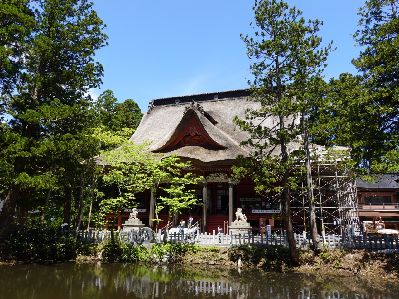 鏡池は、出羽三山神社の本殿前にあります。古来から信仰されている池で、この池の前に本殿が建てられたということのようです。東西38m、南北28mの楕円形をしており、池越しに見る本殿は、また少し違った印象がありました。周囲の新緑よりも色濃い水面も記憶に残っています。