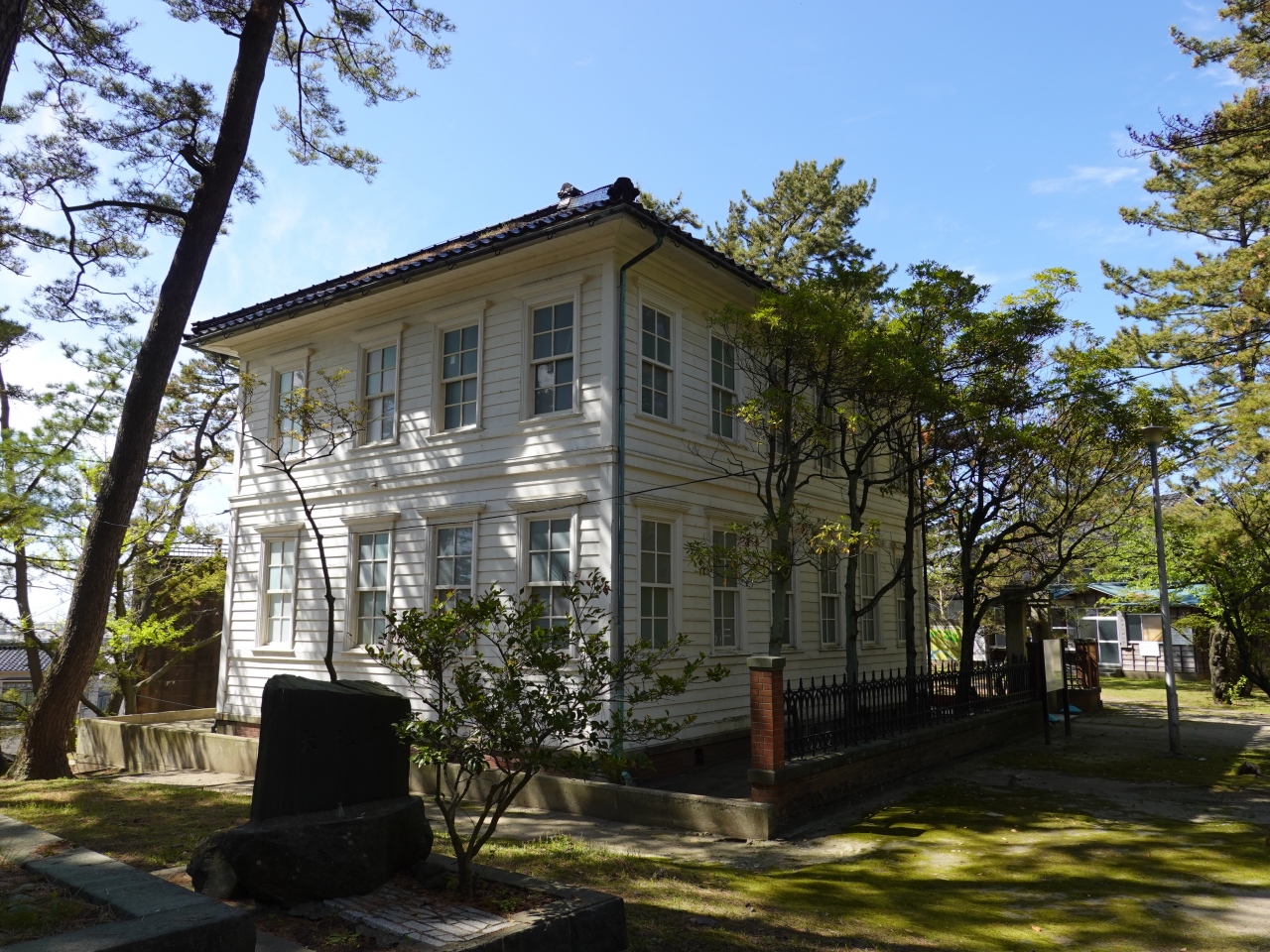 大正8年に建てられた酒田市唯一の木造洋風建築で、1980年に現在地へ移築されたということです。GW明けに訪れたところ、周囲を緑に囲まれて白壁が引き立っていました。酒田市から有形文化財に指定されている必見の建築物です。