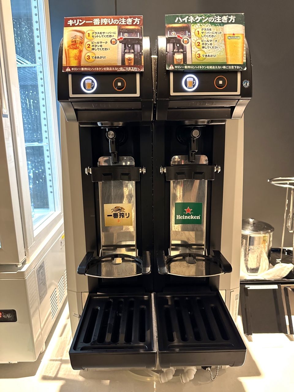 無料のアルコールは生ビールサーバーのハイネケンとキリン「一番搾り」、