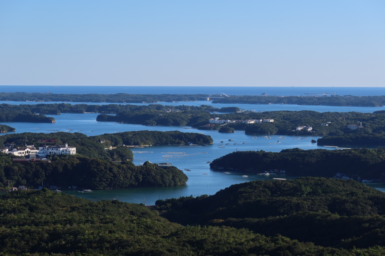 志摩半島の南側、御座岬に囲まれた湾が英虞湾です。海岸線が入り組んだリアス式海岸と賢島をはじめとした多くの島々と穏やかな海が織りなす風景がとてもきれいです。