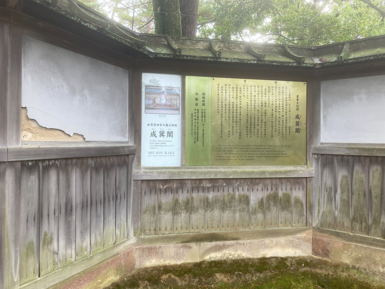 兼六園に隣接して、成巽閣(せいそんかく)という施設がありました。時間がなくて入ることができませんでしたが、13代藩主の前田斉泰が母の隠居所として建築した建物だそうです。江戸末期の大名屋敷の代表的なもので、時間があれば是非見学したいと思います。