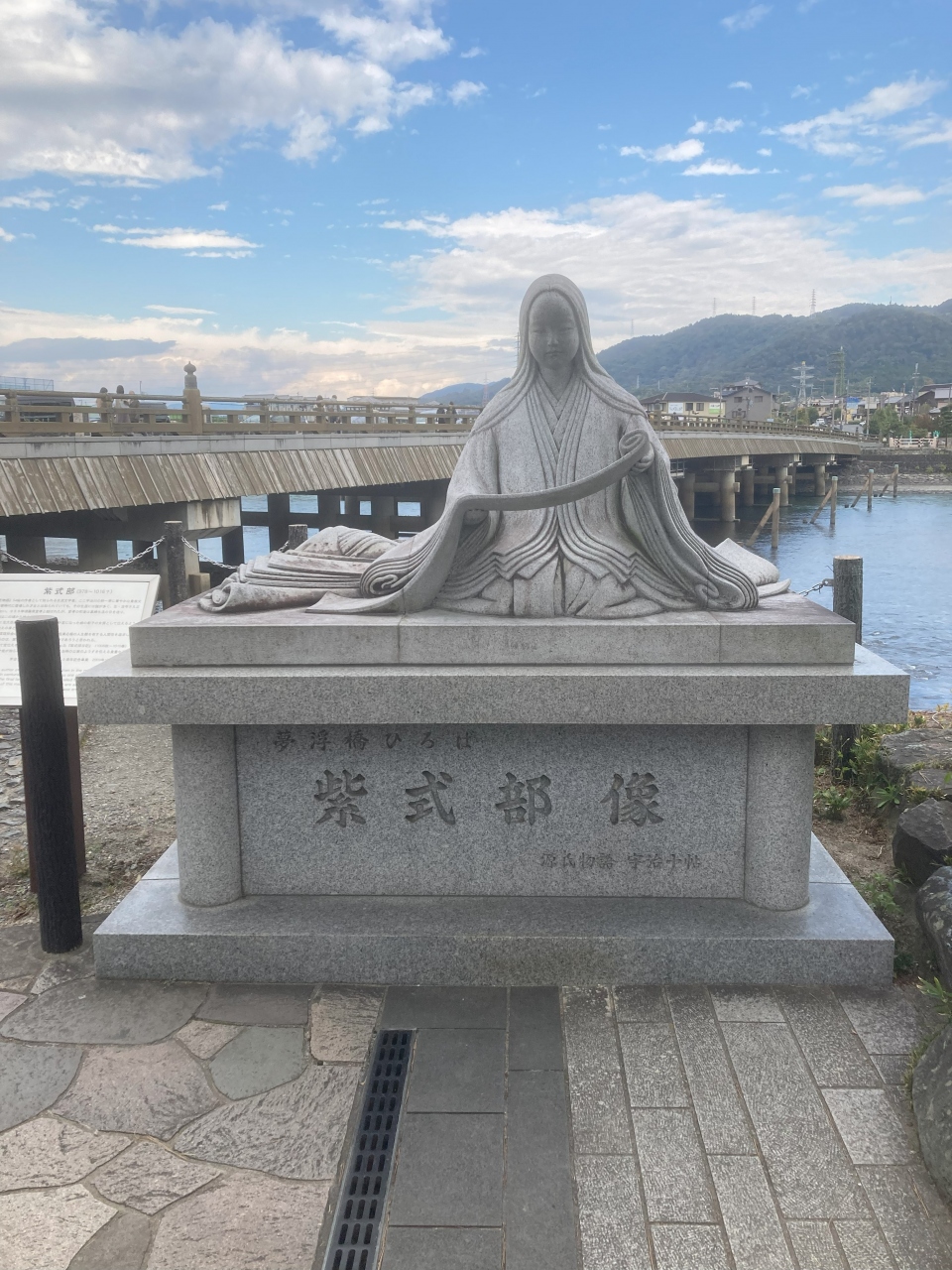 宇治川にかかる宇治橋の西詰にある夢浮橋ひろばを通りました。そこには紫式部の像も設置されていました。源氏物語の宇治十帖に出てくる夢浮橋とのつながりのようですが、詳しくはわかりませんでした。歴史を感じさせる場所であるのは間違いありません。