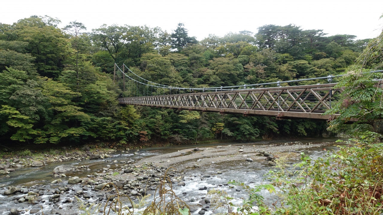 塩原温泉ビジターセンターのすぐ前、国道400号線と旧道(塩原街道)を結ぶ吊橋。車の利用なら塩原温泉ビジターセンターに広い駐車場がある。国道脇から木の階段を下りていくと箒川に架かる吊り橋がある。足の下を流れる箒川はかなり急流で、周囲の森とホテルの建物が美しい。橋を渡り切った対岸には足湯があり、天狗岩も旧道を歩いて5分余り。