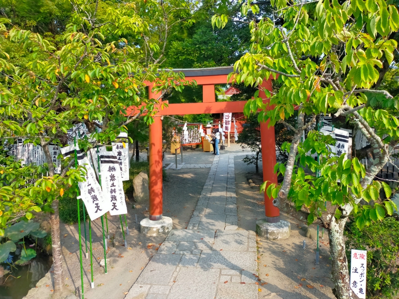 鶴岡八幡宮の境内、源氏池の島にある小さな神社です。源氏池に架かる赤色の橋を渡りながら、蓮の葉が生い茂った源氏池を眺めました。神社の周りには、たくさんの白い旗が並んでいました。観光客はあまりいませんでした。