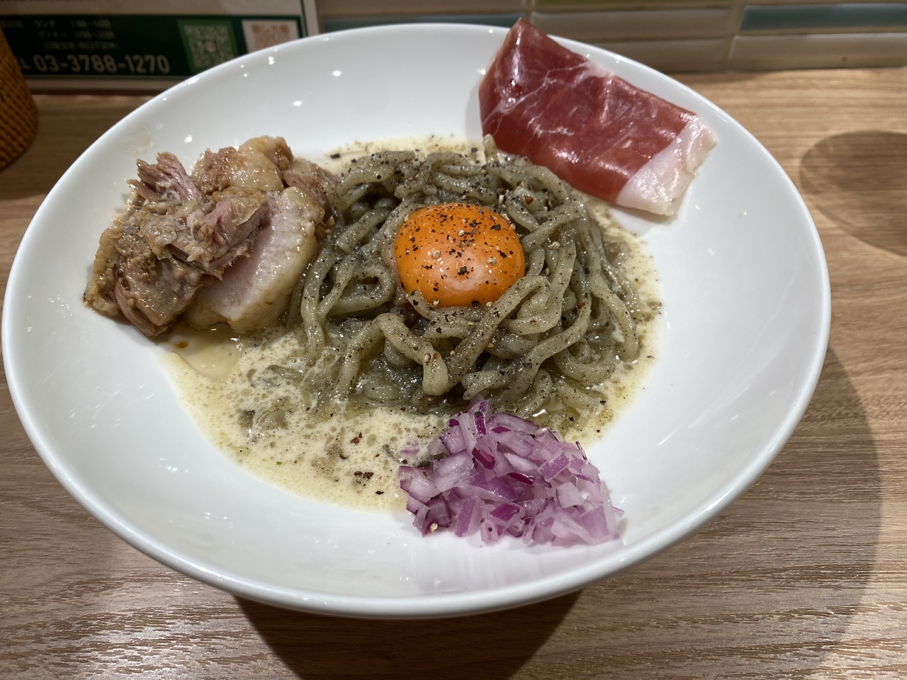 麺はかなりモチモチしていて、煮干しと粒コショウの効いたクリーミーなスープとが絡み合い、