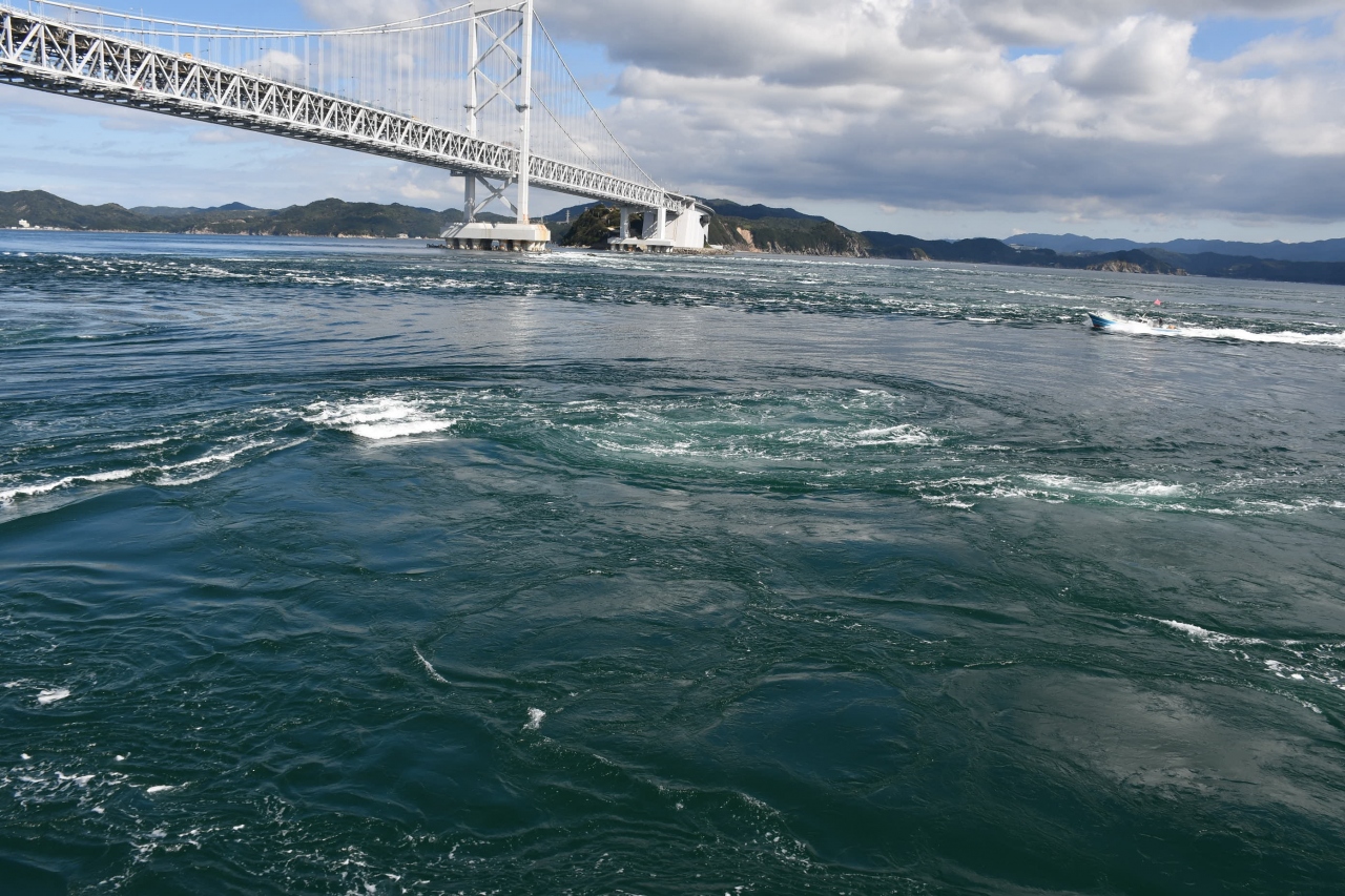 船で鳴門海峡の渦潮見物に行ってきました。船は淡路島の福良港から出て、鳴門海峡大橋の真下まで行きます。大潮などの巡り合わせと、一日のうちでも満潮と干潮によって渦の大きさなどが違うそうです。潮の流れが速いということは実感でき、間近で見る渦潮は迫力がありました。