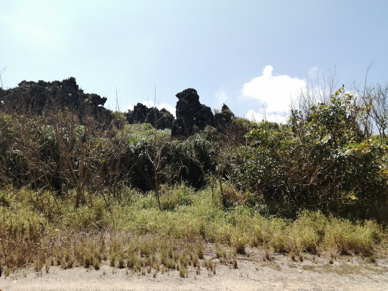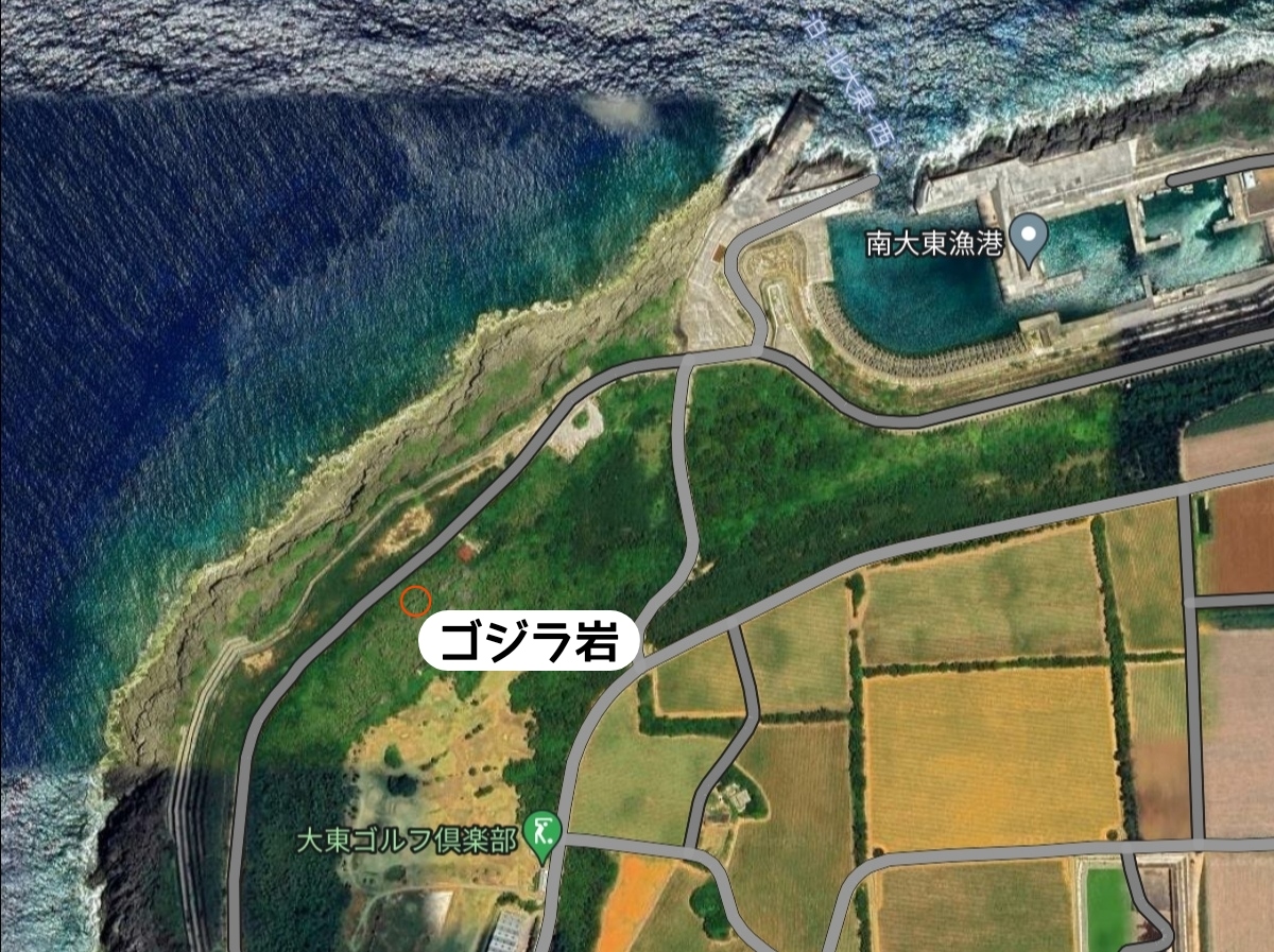 観光マップに“ゴジラ岩”なるスポットが載っていたので出かけてみました。しかーし、マンガチックなざっくりとしたマップなので場所がよく分からない。ネットの情報を頼りになんとか見つけました。皆様が苦労しないように正確な場所を示しておきます。南大東漁港から行けば分かりやすいです。写真の地図を参照して下さい。