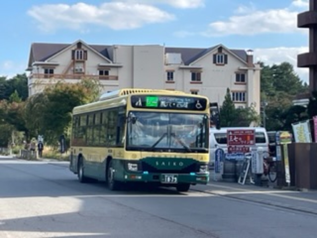 河口湖や西湖を中心に周遊する観光バスです。3系統の色別の路線があります。河口湖畔の河口湖ハーブ館前には河口湖周遊のレッドバスと西湖方面へのグリーンバスが停車し、相互での乗り換えが可能です。バスのカラーリングも系統にあわせてありました。