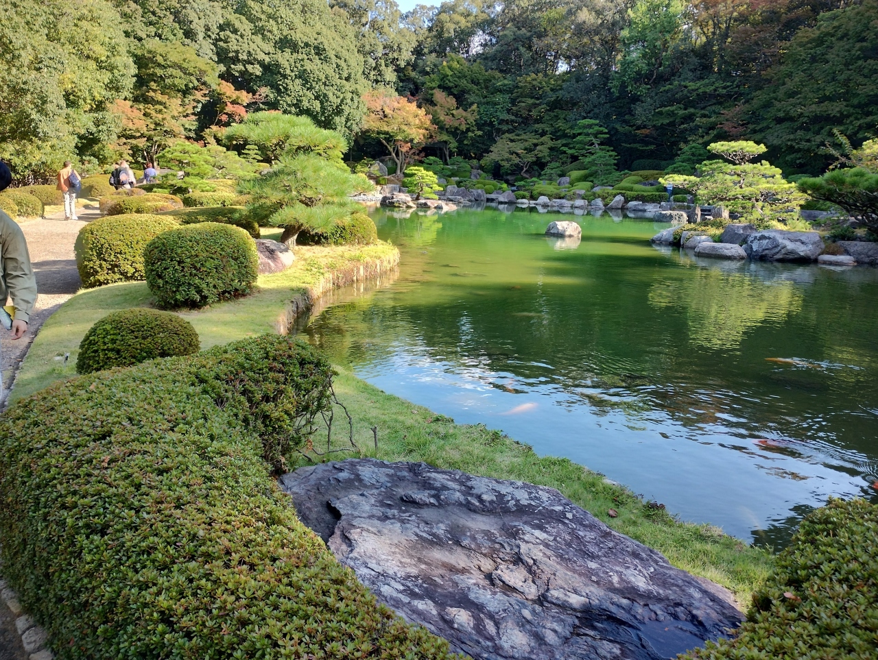 大濠公園の市美術館のすぐそばにあります。ここは、月曜日休館です。パンフレットによると昭和59年に開園した回遊式庭園とのこと。石庭、池、飛び石などを散策しながら楽しみます。規模は、さほど大きくはないのですが、ゆっくりと散策するにはよいと思います。茶室も併設されているのですが、そちらへはまわりませんでした。