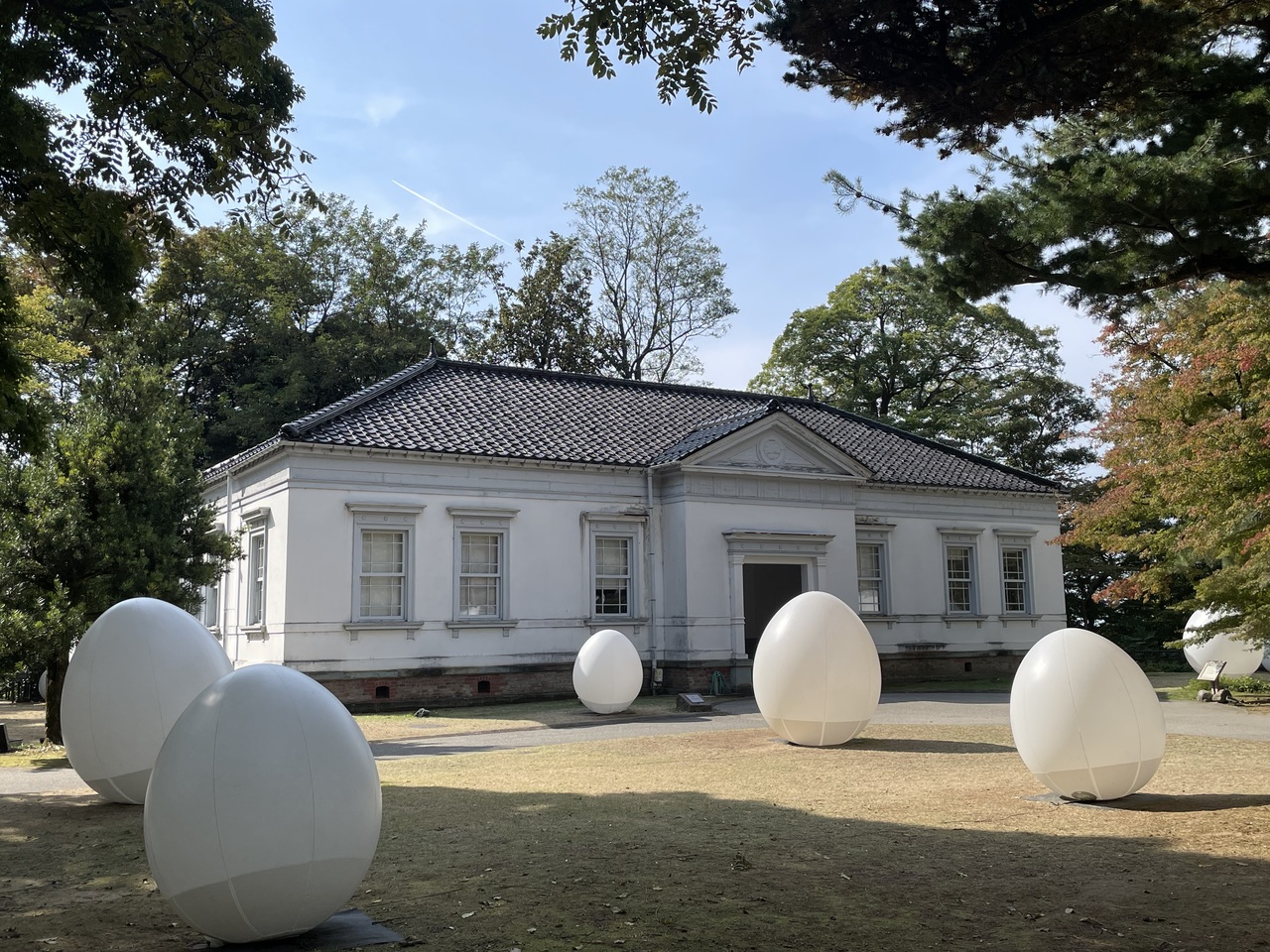 金沢城公園内を散策していると、旧第六旅団司令部の建物の廻りには巨大なたまごのようなオブジェがたくさんありました。金沢百万石まつりの一環のイベント、チームラボの展示物のようです。夜はライトアップされるのでしょう。