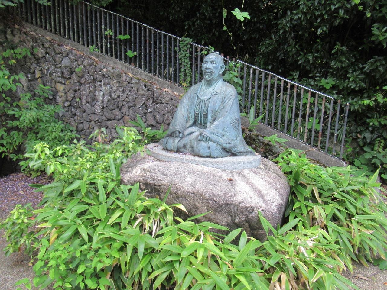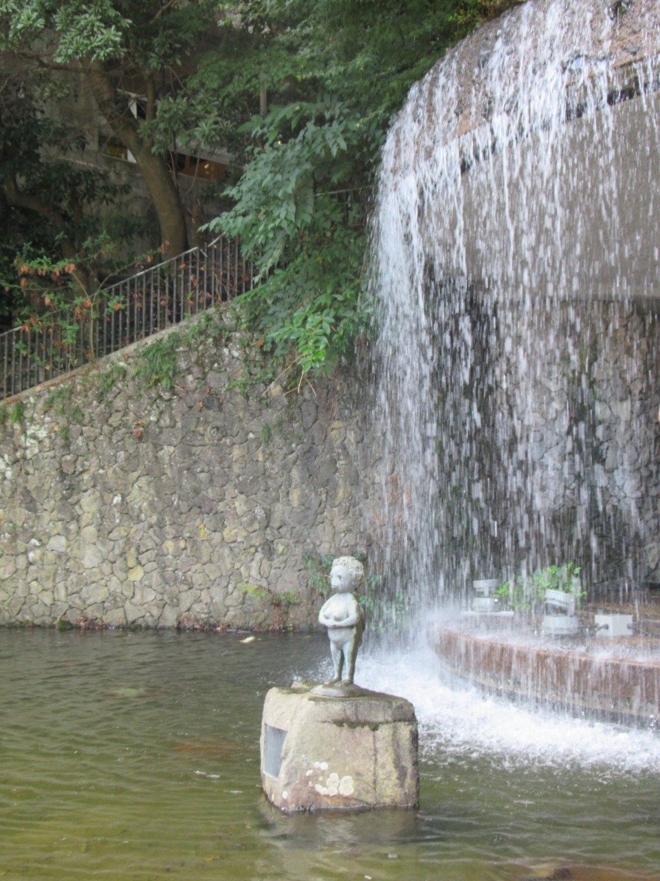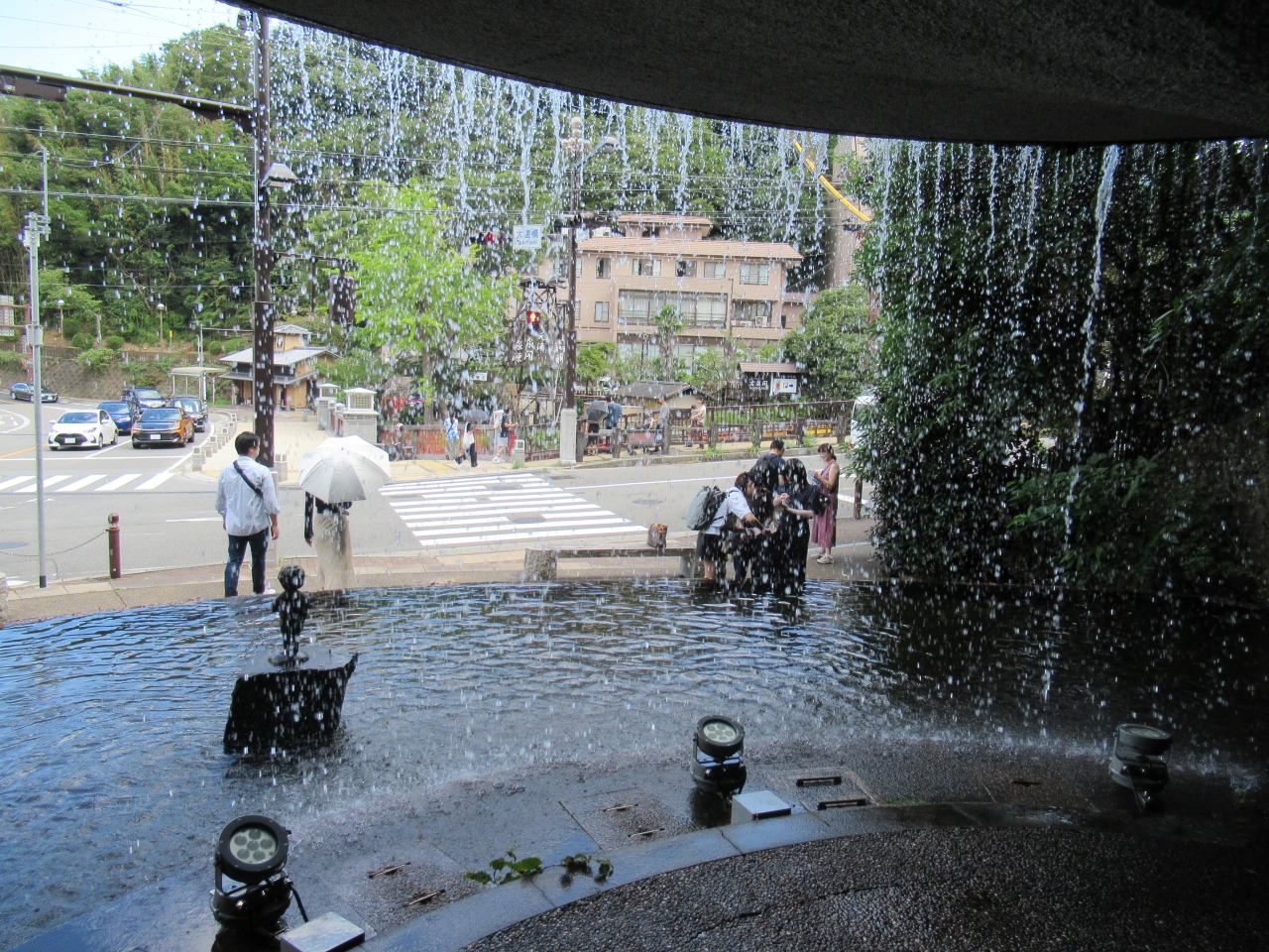 ゆけむり広場の中央には湯けむりに見立てた人口の滝があり、その右側には有馬温泉を愛でていた太閤秀吉の茶人像があります。