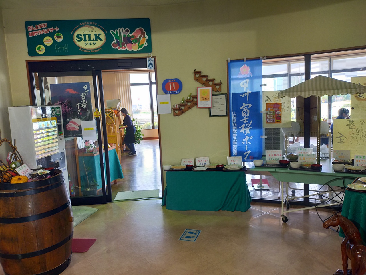 それほど大きくはありませんが、果物や野菜も豊富に売られていて、価格も適切でした。人気のある道の駅であるのもわかります。奥にはレストランがあります。サクラポークとほうとうをいただきましたが、美味しかったです。地元名物の青春のトマト焼きそばもあるようでした。