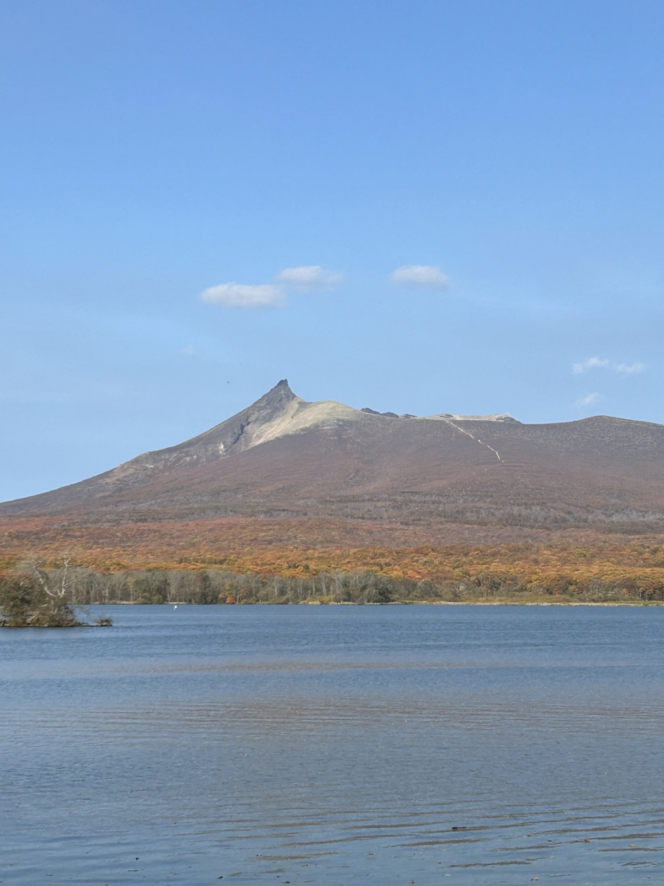 大沼国定公園の遊歩道から綺麗に見えました。山すそが広く山並みが綺麗です。日本二百名山、標高1,131mの活火山で山頂まで1時間程度で登れます。3~5万年前の大噴火によりつくられた角のような峰が特徴で遠くからでも駒ヶ岳だとわかります。