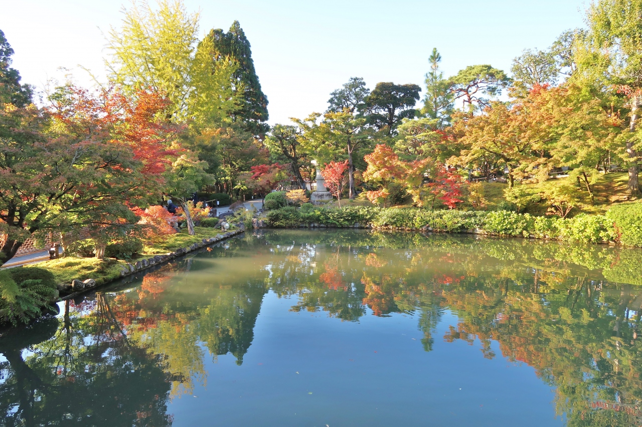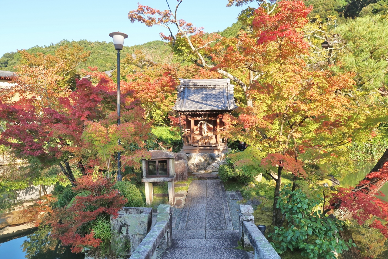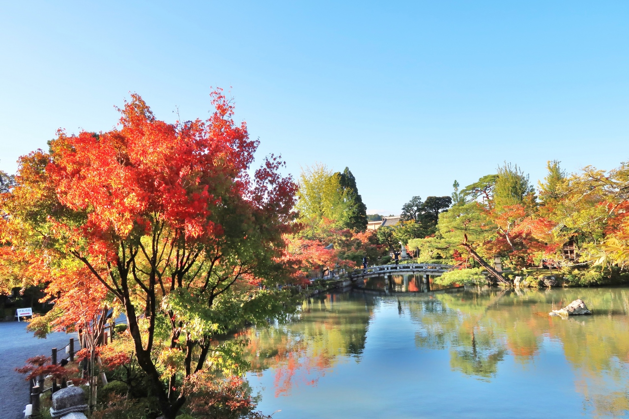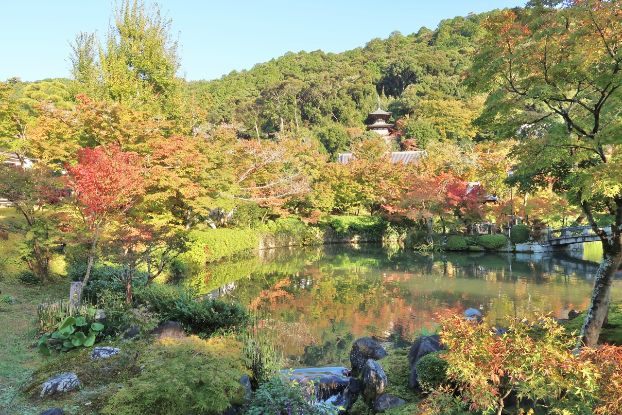 もみじで有名な、浄土宗西山禅林派の総本山禅林寺です。10月だったので境内に人は少なく、静けさの中、五色幕が風に揺れている阿弥陀堂も貸切状態で、振り返って待ってくれているみかえり阿弥陀様と、ゆっくり対面することができました。お寺の前にある無料エリアの池には極楽橋や錦雲橋が架かり、周りの木々の緑、黄色、赤が水面に反映する美しい景色を楽しめました。