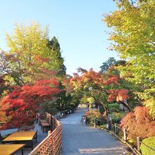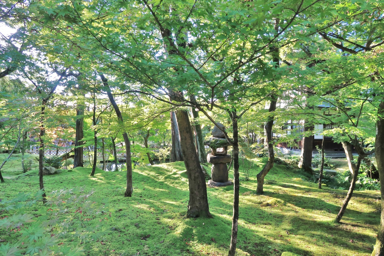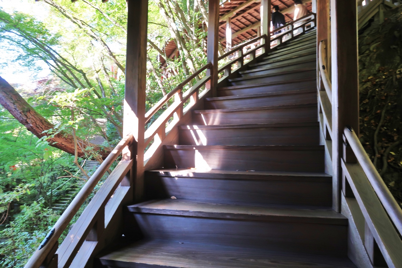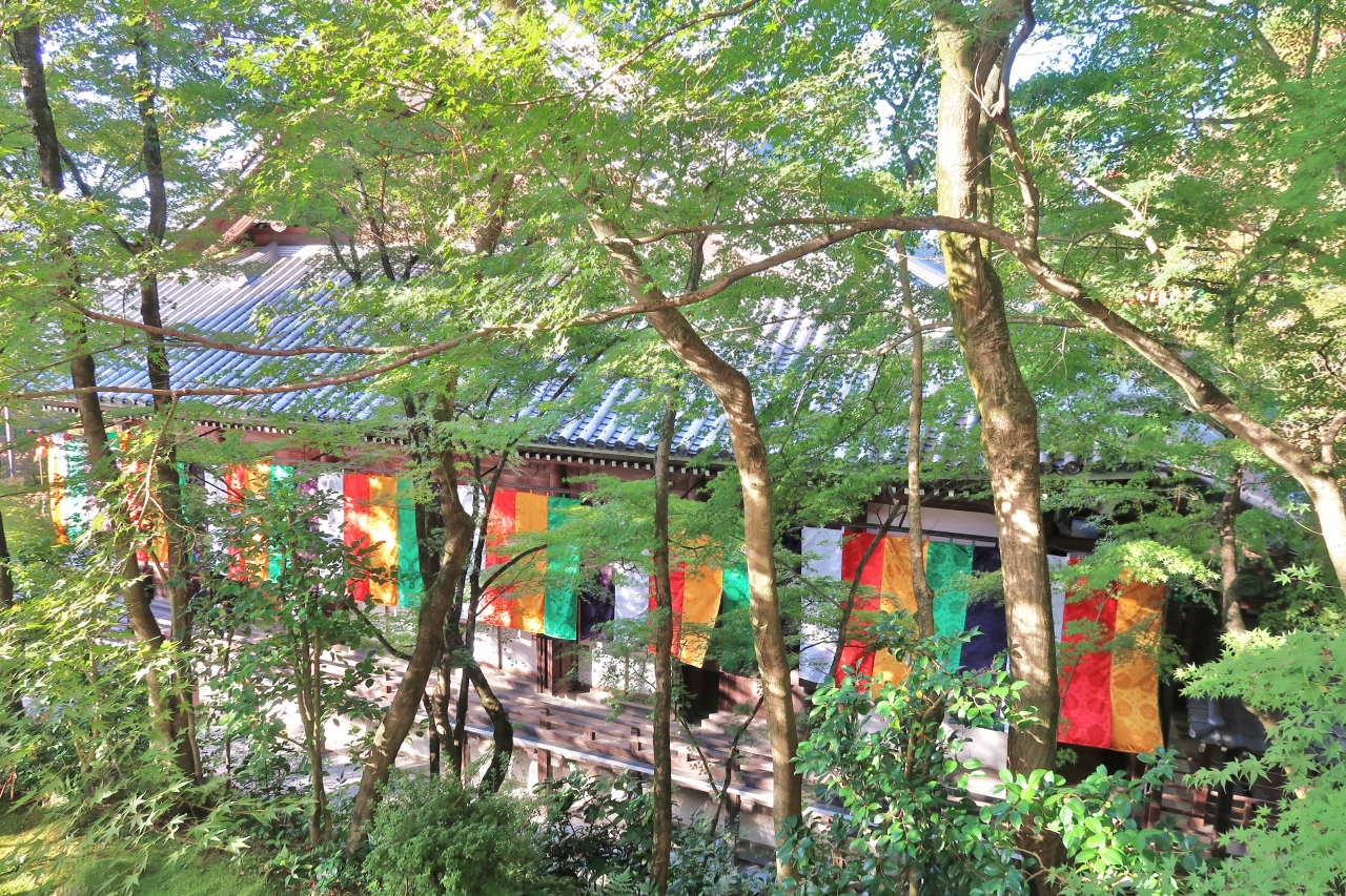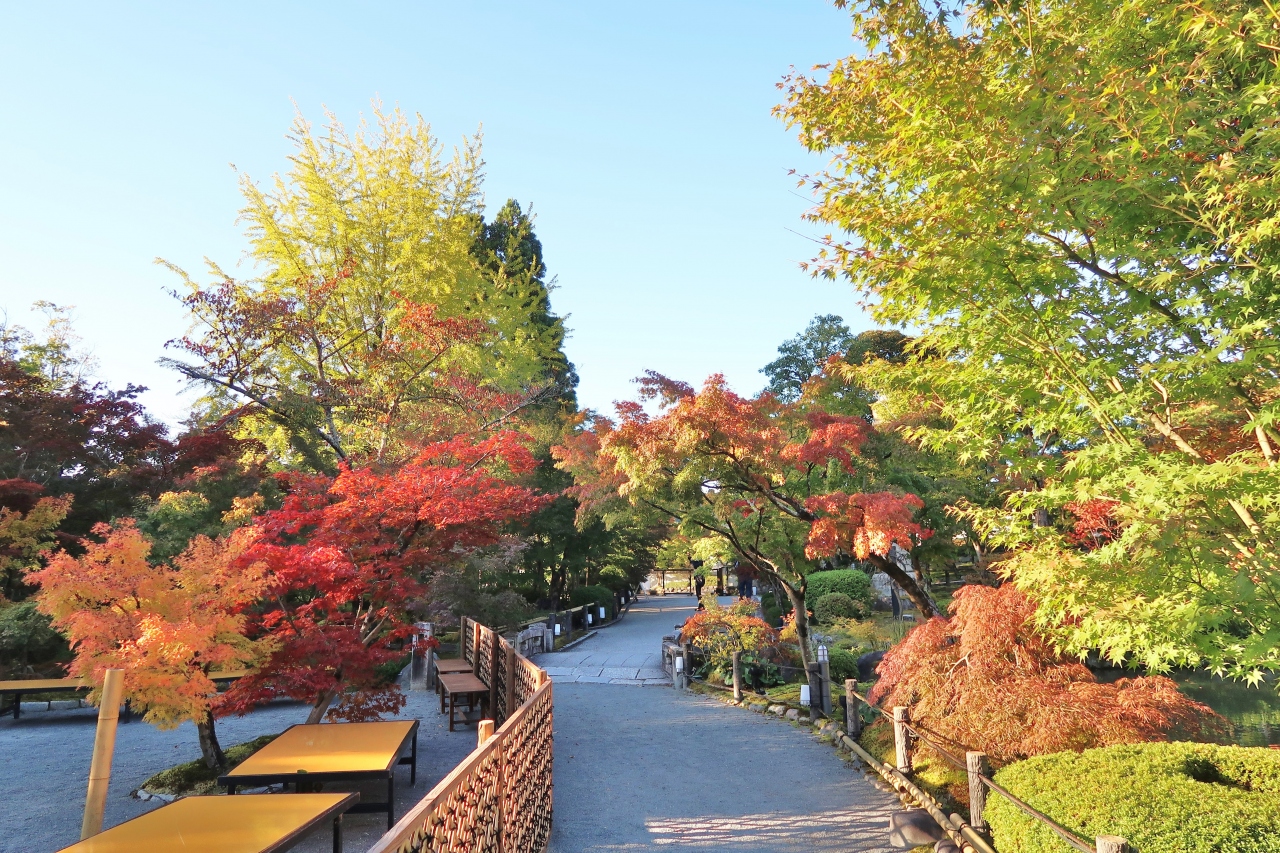 もみじで有名な、浄土宗西山禅林派の総本山禅林寺です。10月だったので境内に人は少なく、静けさの中、五色幕が風に揺れている阿弥陀堂も貸切状態で、振り返って待ってくれているみかえり阿弥陀様と、ゆっくり対面することができました。お寺の前にある無料エリアの池には極楽橋や錦雲橋が架かり、周りの木々の緑、黄色、赤が水面に反映する美しい景色を楽しめました。