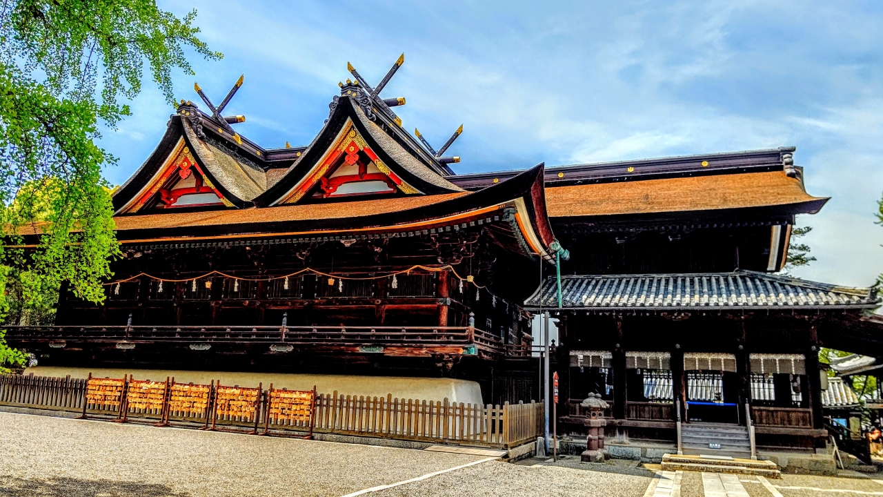 入口から見ると、青々とした木々の間から吉備津神社の社殿が見える。吉備津神社の社殿は室町時代に再建されたもので、拝殿は2棟を1棟に連結させた比翼入母屋造になっている。桃太郎のモデルになっている大吉備津彦大神を主祭神とする神社だ。
