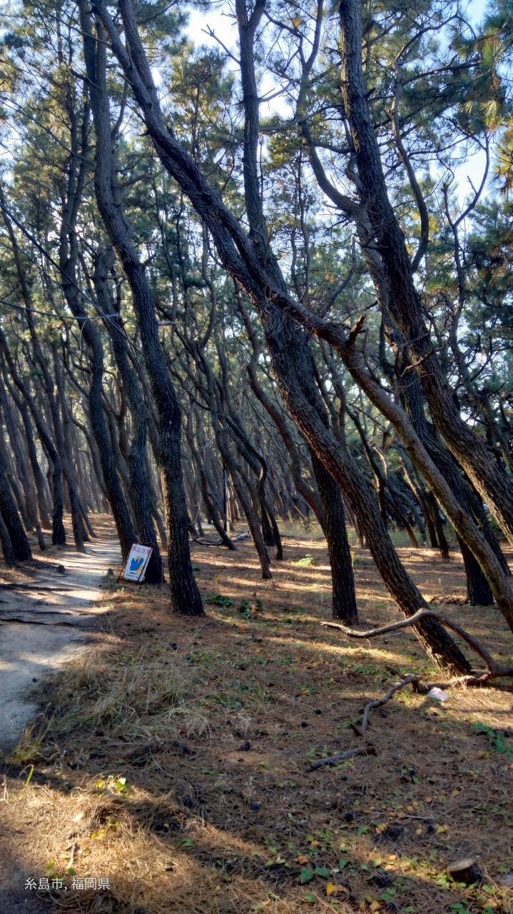 駐車場に車を停めて海岸まで歩くと、海風にあおられて斜めに伸びている松を見ることができます。