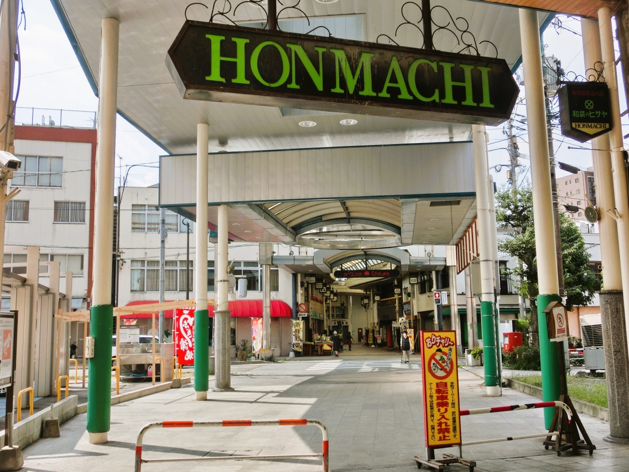 JR新飯塚駅からバスターミナル方向へ向かって芳雄橋を渡って徒歩で15分ぐらい、バスならバスターミナル下車で徒歩3分と市街地中心なので解り易い場所に在るアーケード商店街が「飯塚本町商店街」です。