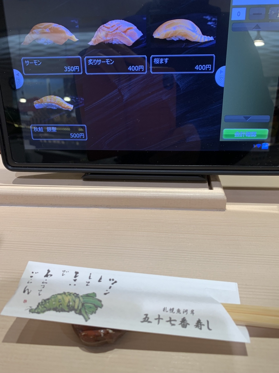 苫小牧で朝、海鮮を食べ損ねたので、心残りで、ここはやはり飛ぶ前に寿司を食べようと。いつもここは気になっていたお寿司屋さんですが、結構混んでいて食べたことはありません。今日は時間も早く(10時半位)、空いていました。タブレットでの注文です。やはり値段は高め、一貫400円程です。タレ等が始めから付けてあって醤油は付けないでそのまま頂くスタイルです。お高いですが、ネタは厚みがあって、大きく、新鮮でとても美味しかったです。ほっけ、にしん、ブランド鮭、つぶ貝を4貫食べて満足しました。また空港に来た時には、寄ろうと思います。