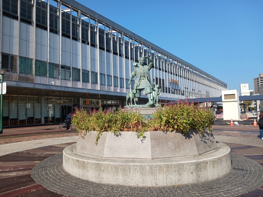 岡山駅の東口広場に桃太郎の銅像がありました。岡山桃太郎空港からリムジンで西口に着いてから駅の周りを歩くと東口広場に出ました。路面電車も東口から離発着していますので賑やかでした。岡山はどこでも桃太郎伝説が在るところでした。