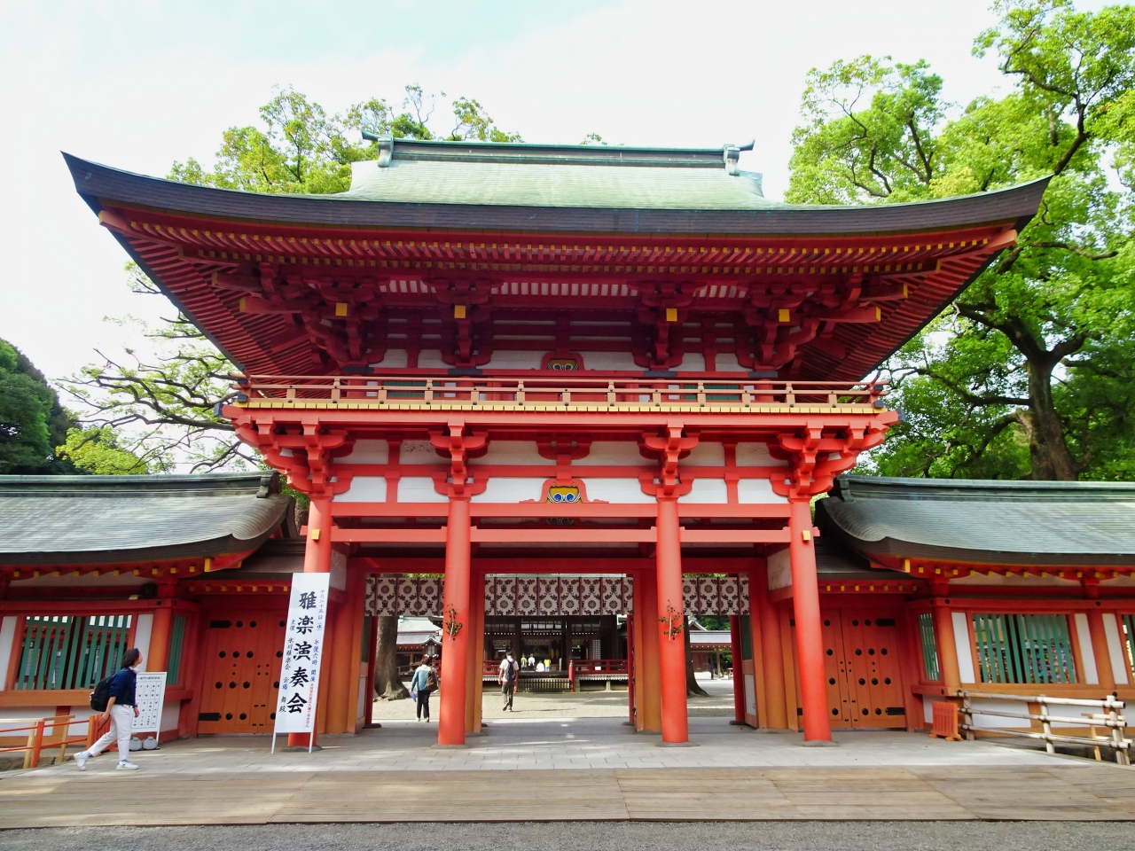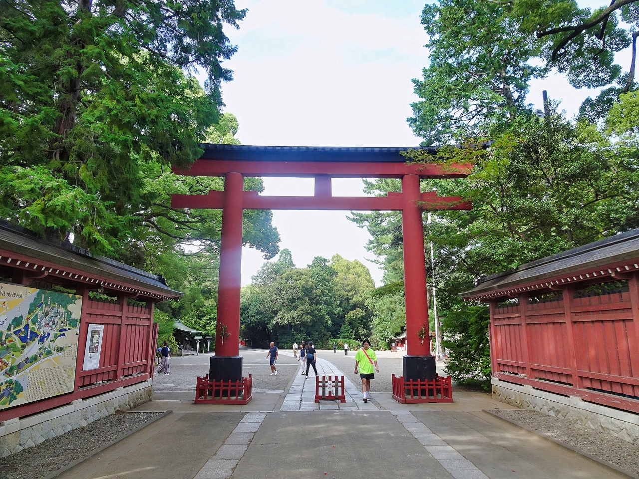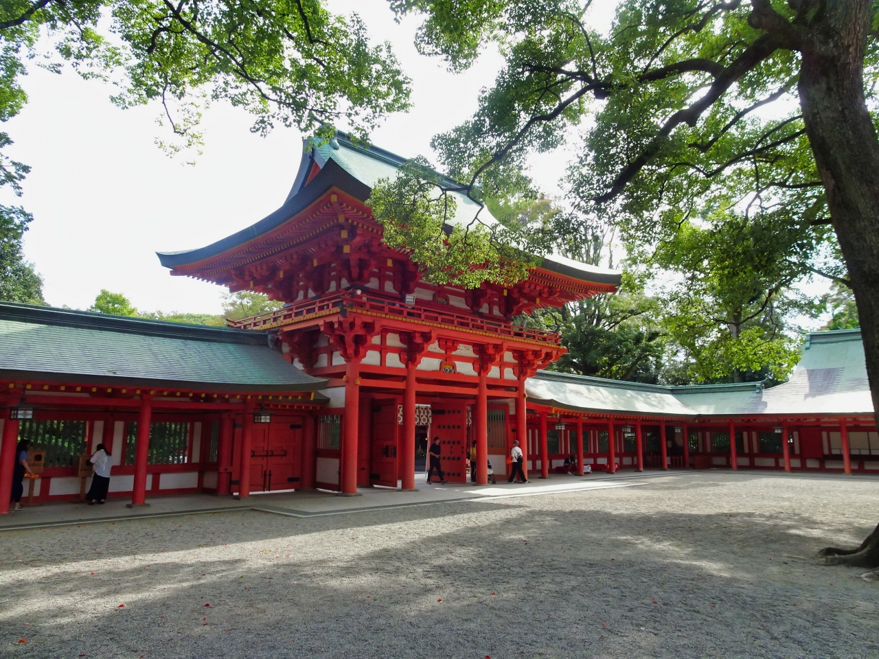 2017年正月に初詣に訪れて以来の再訪。前回は初詣客に圧倒されて慌ただしい参拝でしたが、今回はゆっくり参拝できました。緑に覆われた広くて長い参道を歩き、三の鳥居をくぐってからも広い境内を進み、神池に架る朱塗りの橋を超えると、楼門の大きさに圧倒。舞殿、拝殿と進んで、家族の健康を祈願しました。