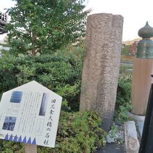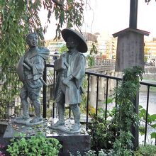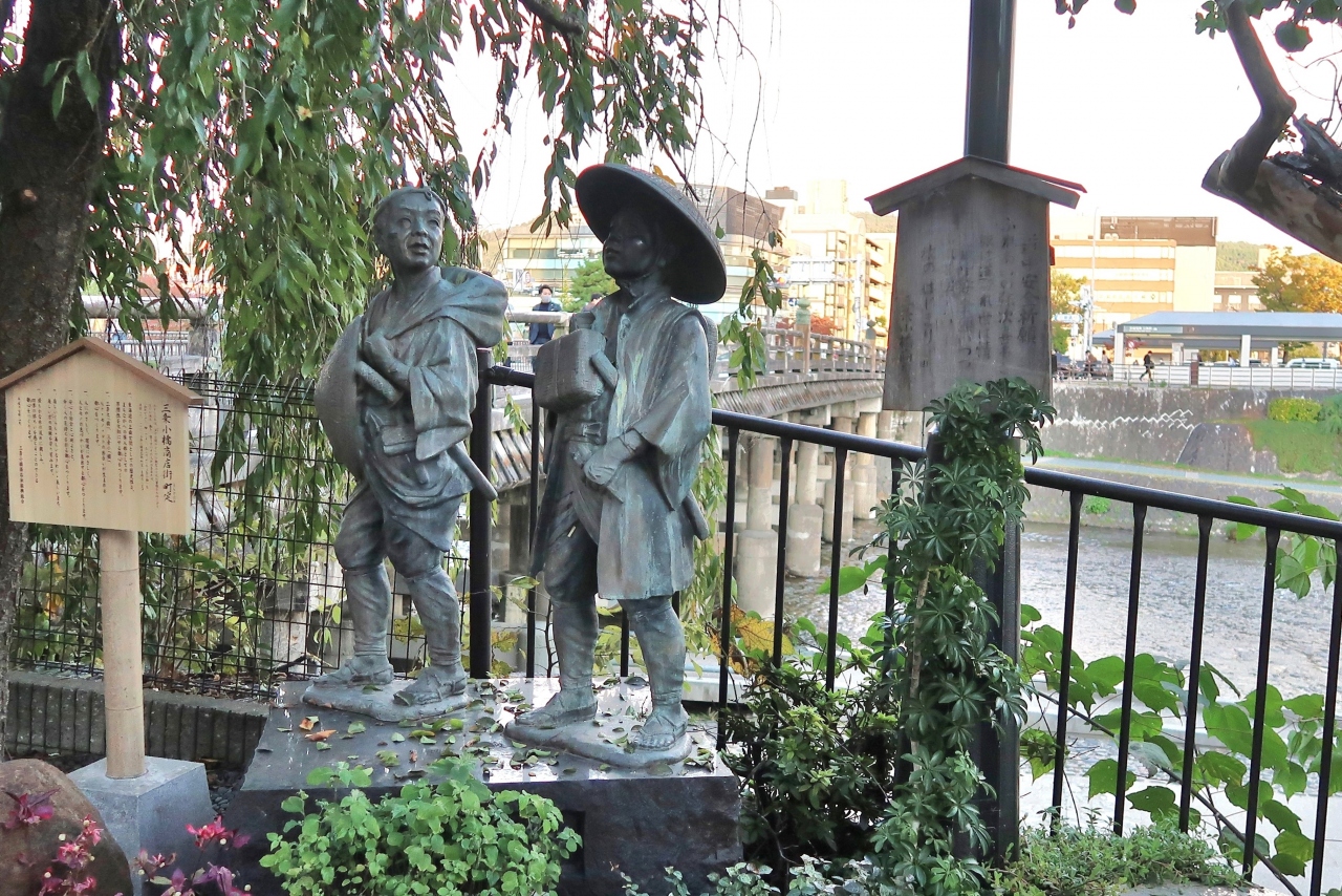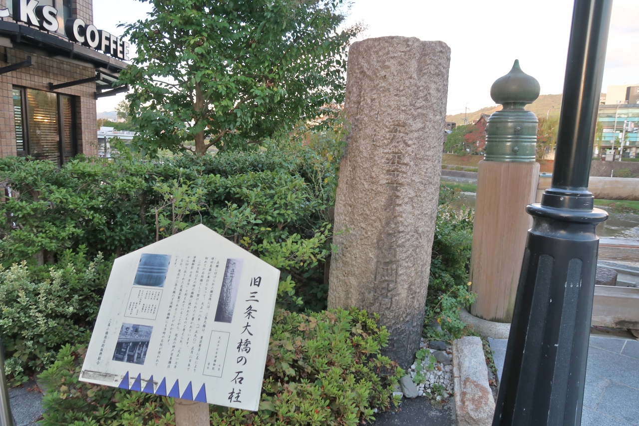 三条大橋の北西(スタバ前)の袂に石柱と説明板あり。豊臣秀吉による日本で最初の石柱橋だそうです。下流側の橋脚にも当時の石柱が使われているとのことですので、東海道中膝栗毛の弥次さんの後ろに見える橋脚がその石柱かと思われます。欄干の擬宝珠の刀傷の左側に天正18年に架けられた云々の刻文が刻まれていました。